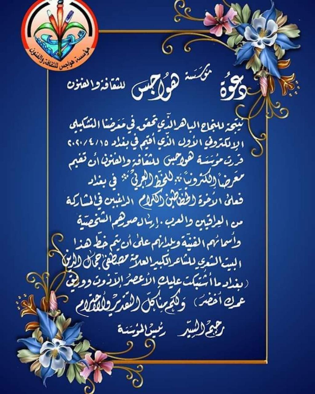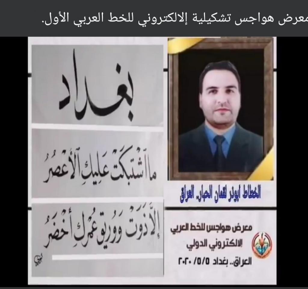 مسابقة دولية في الخط العربيشارك الدكتور ابوذر لقمان الحبار التدريسي في كلية العلوم الإسلامية في قسم الحديث وعلومه بالمسابقة الدولية للخط العربي التي أقامتها مؤسسة هواجس للثقافة والفنون في بغداد بتاريخ 5/5/2020.. والتي شارك فيها خطاطون من معظم البلدان العربية والإسلامية لمشاهدة المعرض الدخول الى الرابط :انقر هنا للمشاهدة على اليوتيوب