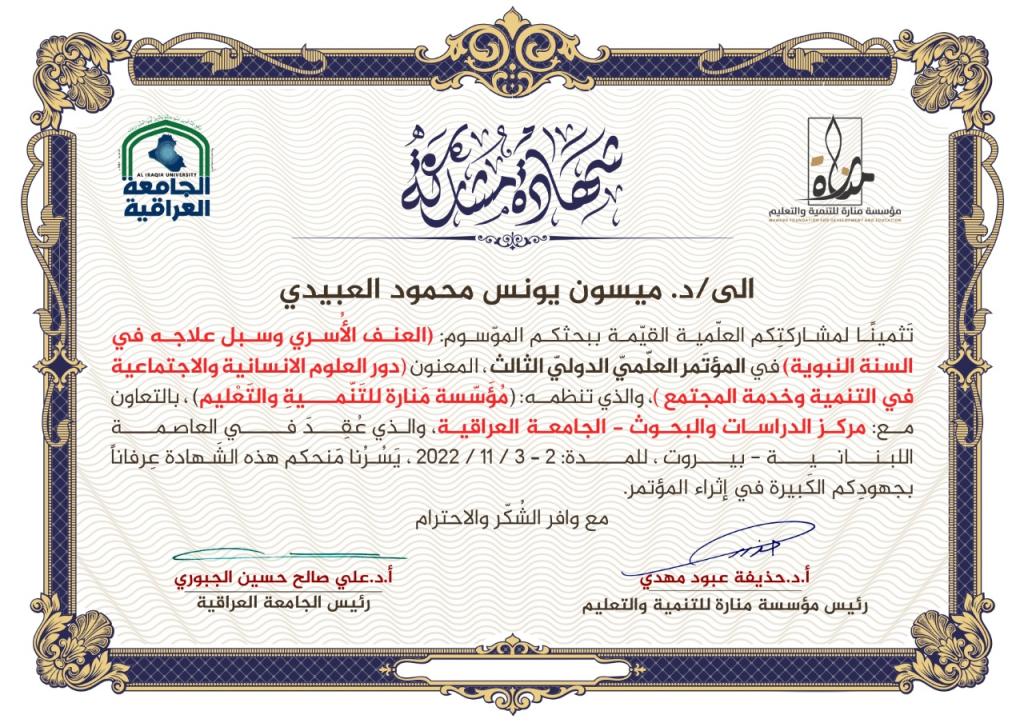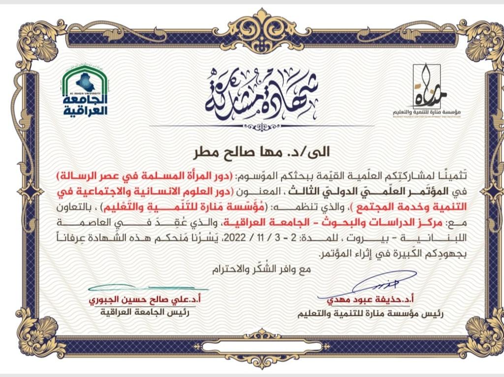 شاركت كل من الدكتورة مها صالح مطر التدريسية في قسم العقيدة والفكر الإسلامي ببحثها الموسوم (دور المرأة المسلمة في عصر الرسالة) والدكتورة ميسون يونس العبيدي التدريسية في قسم العقيدة والفكر الإسلامي ببحثها الموسوم (العنف الاسري وسبل علاجه في السنة النبوية ) في المؤتمر العلمي الدولي الثالث والذي عقد في العاصمة اللبنانية / بيروت للمدة 2-3/11/ 2022 تحت عنوان (دور العلوم الإنسانية والاجتماعية في التنمية وخدمة المجتمع ) والذي تنظمه مؤسسة منارة للتنمية والتعليم بالتعاون مع مركز الدراسات والبحوث – الجامعة العراقية .وقد شارك في أعمال المؤتمر نخبة من الباحثين من مختلف البلدان ( العراق، لبنان ،عمان، اليمن ، مصر، نيجيريا ،السودان) .