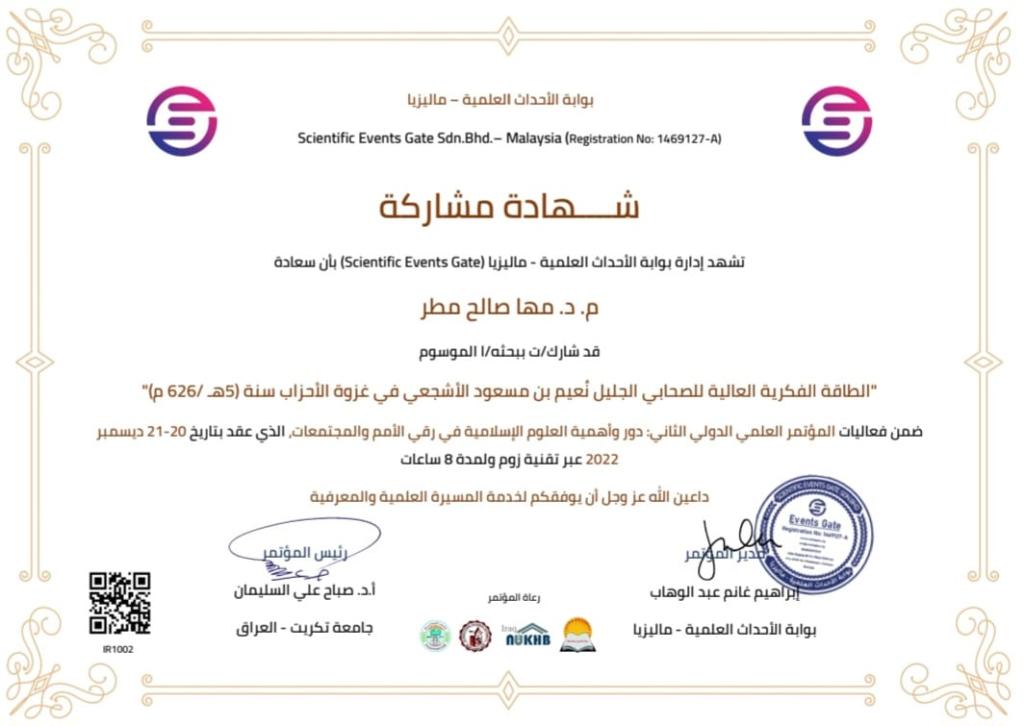 شاركت الدكتورة مها صالح مطر التدريسية في قسم العقيدة والفكر الاسلامي في المؤتمر العلمي الدولي الثاني الذي أقيم في ماليزيا تحت عنوان دور وأهمية العلوم الإسلامية في رقي الأمم والمجتمعات بتاريخ 20-21/12/2022 ببحثها الموسوم (الطاقة الفكرية العالية للصحابي الجليل نُعيم بن مسعود الأشجعي في غزوة الأحزاب سنة 5هـ/626م) عبر تقنية زوم ولمدة(8) ساعات .
