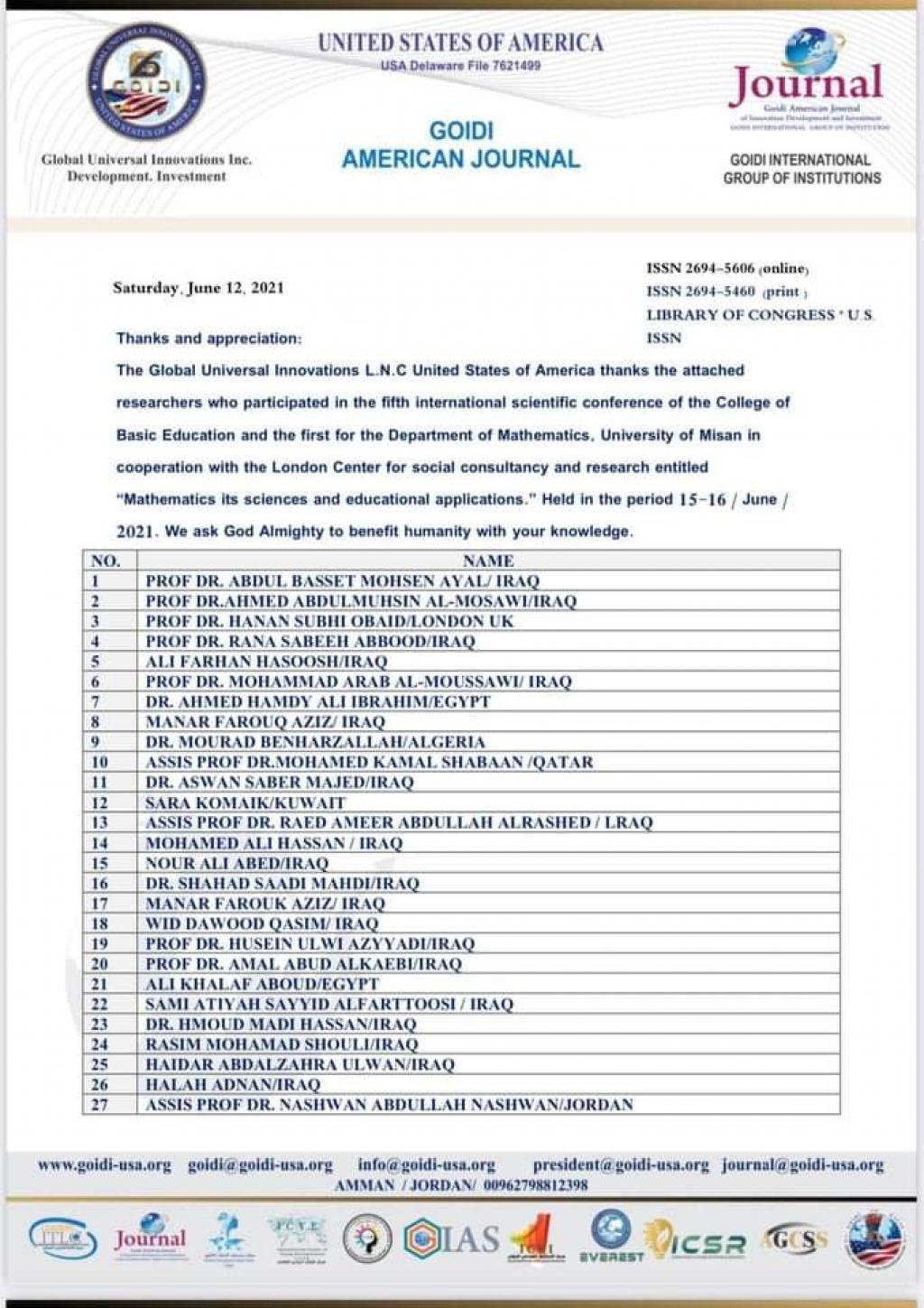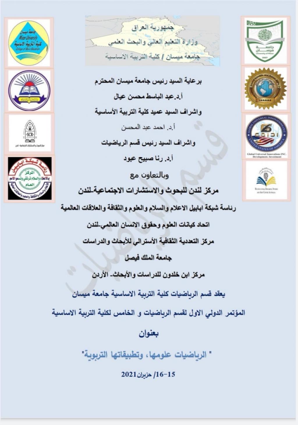 شارك ا. م. د. رائد أمير عبد الله التدريسي في قسم الحديث وعلومه في المؤتمر العلمي الافتراضي الدولي الأول الذي عقد في كلية التربية جامعة ميسان بالتعاون مع مركز لندن للبحوث الاجتماعية ومركز ابن خلدون في الأردن ومركز التعددية الثقافية الأسترالية في جامعة الملك فيصل واتحاد كيانات العلوم وحقوق الإنسان في لندن وشبكة ابابيل للإعلام من ١٥١٦٢٠٢١ بالبحث الموسم طرائق وأساليب التدريس الالكترونية جامعة الموصل انموذجا وقد نال على شهادة مشاركة من جامعة ميسان وشكر وتقدير من الهيئة العالمية الأمريكية للاختراع والإبداع