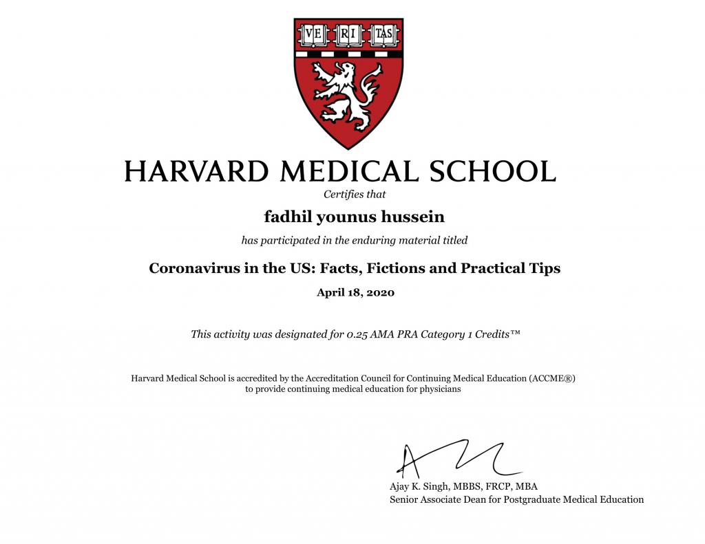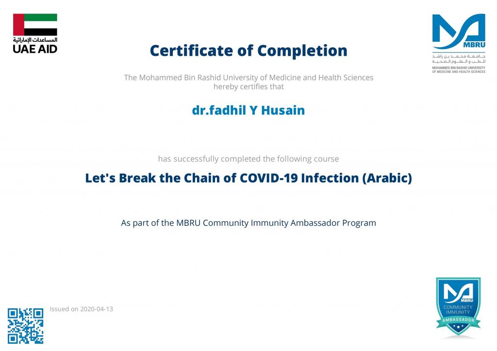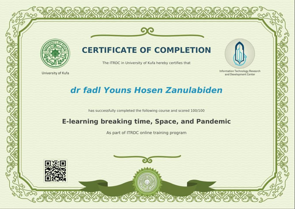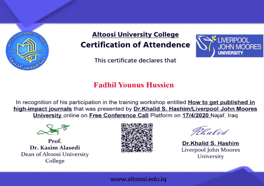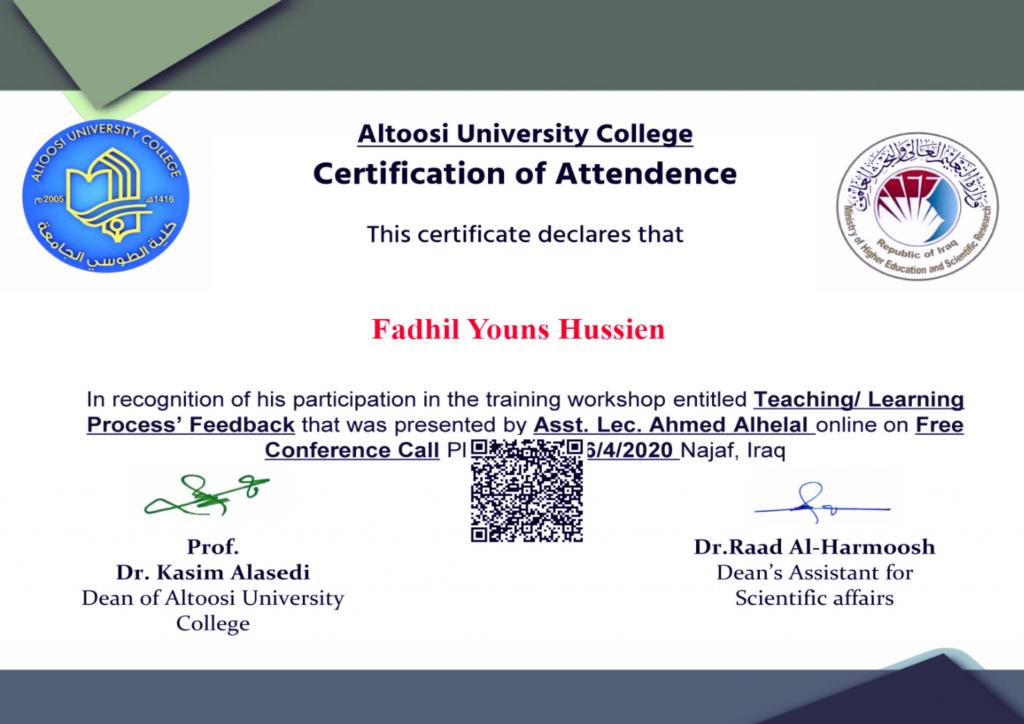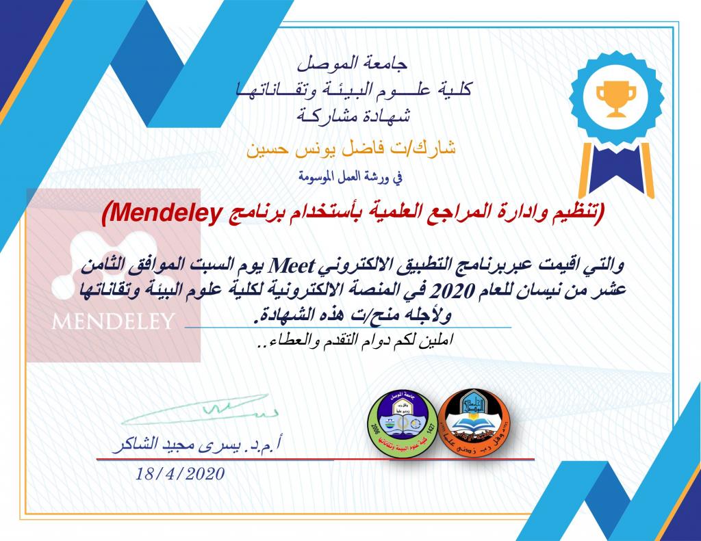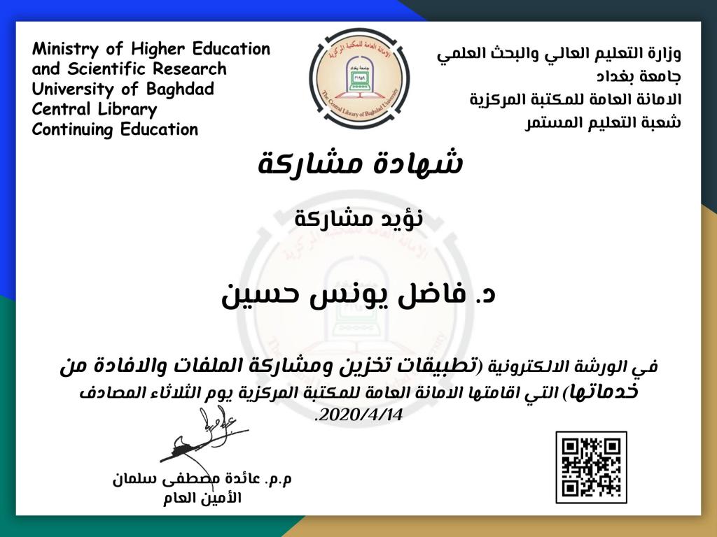 مشاركات علميةحصل الدكتورفاضل يونس حسين مقرر الدراسة المسائية في قسم العقيدة والفكر الإسلامي ومسؤول وحدة المختبرات على العديد من شهادات المشاركة في الدورات التدريبية وورش العمل الإلكترونية وتثمن عمادة الكلية هذه المساهمات العلمية الهادفة وتدعو إلى المزيد من المشاركات الفعالة في خدمة جامعة الموصل و المجتمع.
