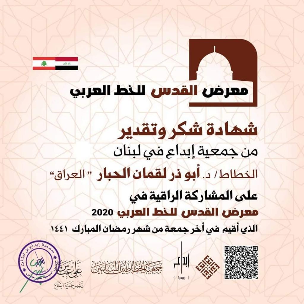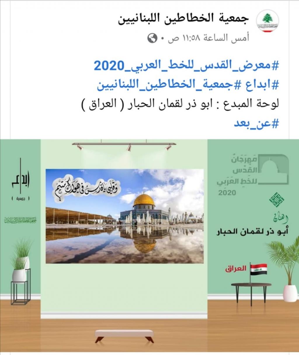 ضمن فعاليات مهرجان القدس للخط العربي والزخرفة الإسلامية الدولي وبمناسبة اليوم العالمي للقدس.. شارك الدكتور ابوذر لقمان الحبار التدريسي في كلية العلوم الإسلامية / قسم الحديث وعلومه بمهرجان القدس والتي اقامتها جمعية الخطاطين اللبنانيين بالتعاون مع مؤسسة إبداع اللبنانية يوم الجمعة الاخيرة من شهر رمضان المبارك الموافق 15/5/2020 وقد شارك في هذا المهرجان جمع غفير من خطاطي العالم من مختلف الدول العربية والإسلامية