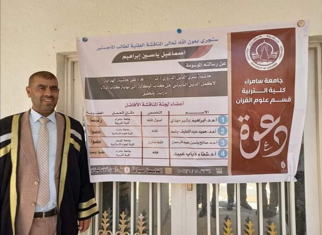 شارك الأستاذ المساعد الدكتور صالح ياسين عبد الرحمن التدريسي في قسم العقيدة والفكر الاسلامي في كليتنا مناقشة رسالة الماجستير للطالب اسماعيل ياسين ابراهيم اللهيبي.عن رسالته الموسومة (حاشية سري الدين الدّروري ت ١٠٦٦هـ على حاشيه الهداية لأكمل الدين البابرتي من كتاب الوكالة الى نهاية كتاب الولاء دراسة وتحقيق) في قسم علوم القرآن/ كلية التربية للعلوم الانسانية/ جامعة سامراء. يعتبر الإمام الدّوري رحمه الله والبابرتي من فقهاء المذهب الحنفي. إذ شرح الإمام الدّروري حاشية البابرتي العناية على شرح الهداية للمرغيناني رحمهم الله تعالى. إذ شرحها شرحاً مفصلاً على أبواب الفقه الاسلامي وكانت لجنة المناقشة مؤلفة من السادة كل من.أ. م. د إبراهيم بشير مهدي رئيساً.أ. م. د حميد عبد اللطيف جاسم عضواً.أ. م. د صالح ياسين عبد الرحمن الجبوري عضواً.أ. د شفاء ذياب عبيد عضواً مشرفاً.مبارك للطالب ولمشرفة هذا الإنجاز العلمي.