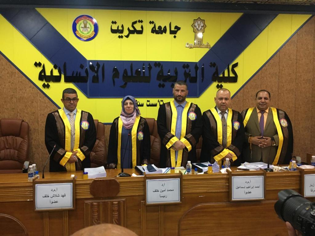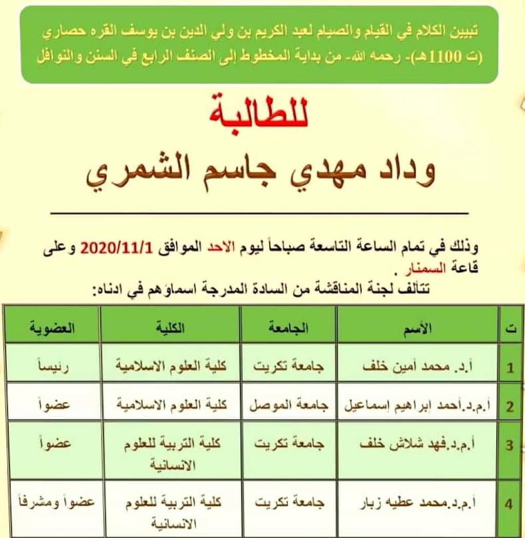 شارك التدريسي في قسم الشريعة الأستاذ المساعد الدكتور أحمد إبراهيم إسماعيل الصالحي في مناقشة رسالة ماجستير في كلية التربية للعلوم الإنسانية بجامعة تكريت هذا اليوم الأحد الموافق ١ / ١١ / ٢٠٢٠وكانت الرسالة تحقيقا لأحد المخطوطات القديمة في الفقه الحنفي والموسومة (تبيين الكلام في القيام والصيام لعبد الكريم بن ولي الدين بن يوسف القره حصاري (ت 1100هـ)- رحمه الله- من بداية المخطوط إلى الصنف الرابع في السنن والنوافل ).وتأتي هذه المشاركات في إطار التعاون العلمي بين كلية العلوم الإسلامية بجامعة الموصل وكلية التربية للعلوم الإنسانية بجامعة تكريت.
