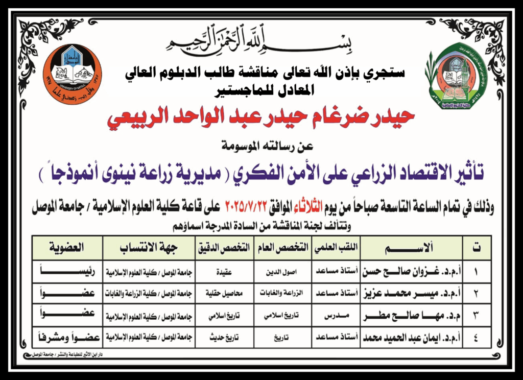نوقشت هذا اليوم الثلاثاء الموافق 15/ 7 /2025 في كلية العلوم الإسلامية بجامعة الموصل رسالة الدبلوم العالي (المعادل للماجستير) الموسومة ( الوسطية والاعتدال وأثرها في ترسيخ الأمن الفكري) .
