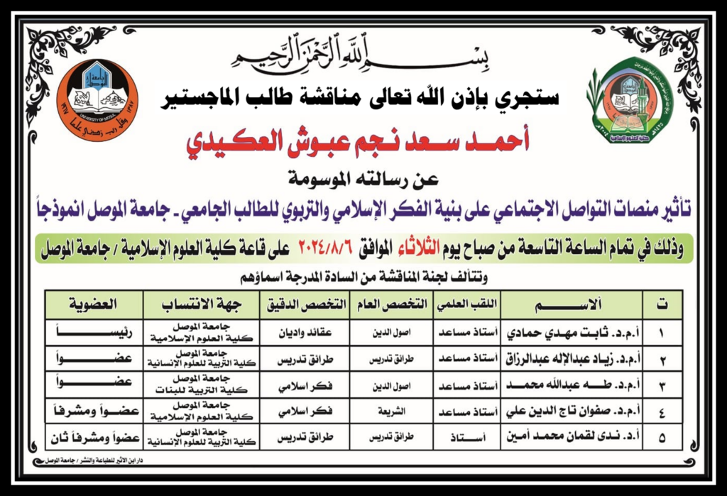 نوقشت اليوم الاحد الموافق 4/8/2024 في كلية العلوم الإسلامية بجامعة الموصل رسالة الماجستير الموسومة (الاستنباطات الفقهية من مرويات الصحابي الجليل عمران بن حصين رضي الله عنه في الكتب التسعة-دراسة مقارنة) حضر جانباً منها السيد عميد الكلية الأستاذ الدكتور طه حماد مخلف والسيدان المعاونان العلمي والإداري وعدد من تدريسيي الكلية.