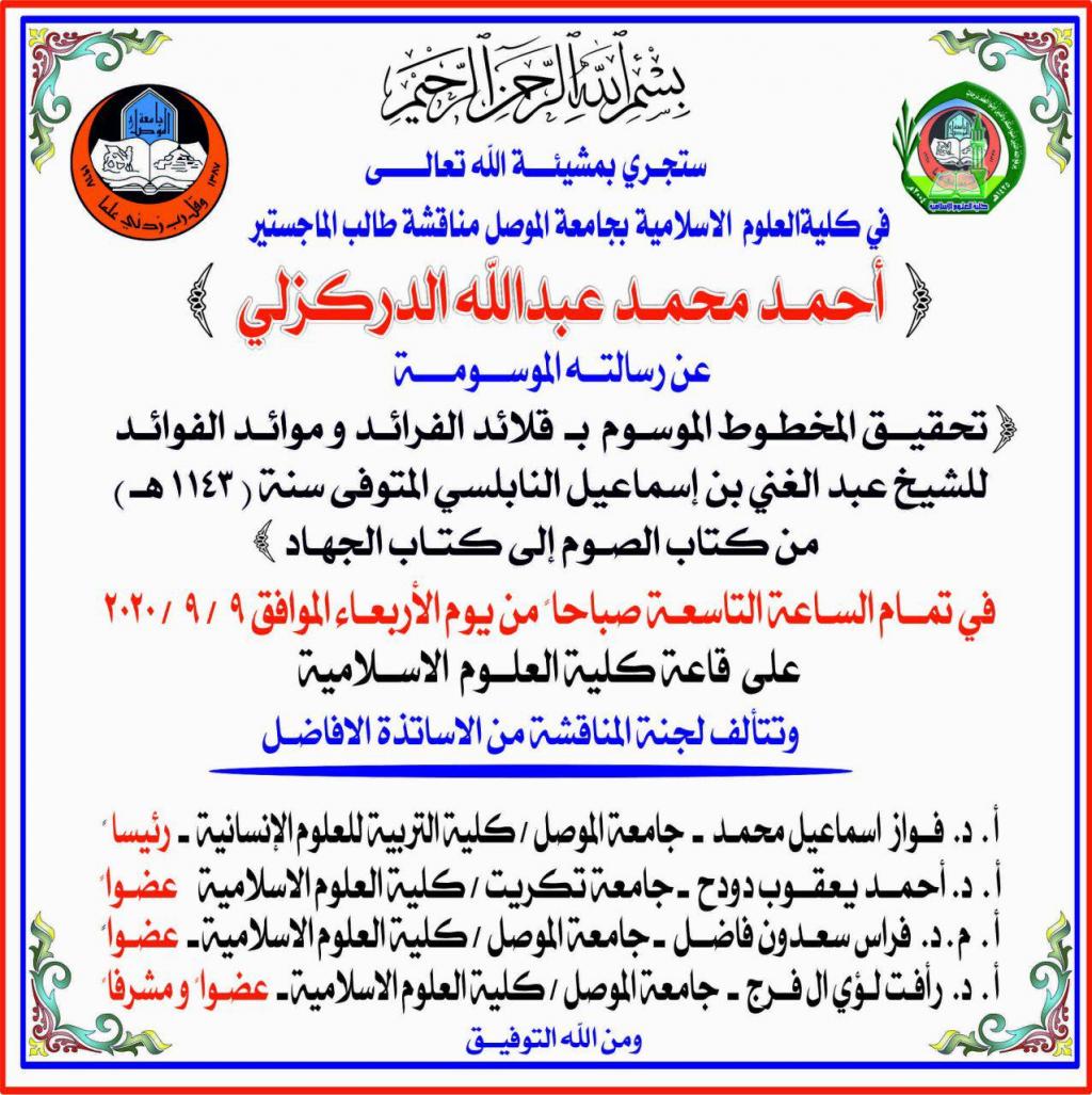 جرت صباح هذا اليوم الاربعاء الموافق ٩ / ٩ / ٢٠٢٠ مناقشة طالب الماجستير السيد ( احمد محمد عبد الله الدركزلي ) في رسالته بالفقه الاسلامي، وقد حصل الطالب فيها على تقدير امتياز.. وتبارك عمادة كلية العلوم الإسلامية ورئاسة قسم الشريعة للباحث هذا الإنجاز العلمي المتميز وإلى مزيد من التفوق العلمي لجميع طلبتنا الاعزاء.