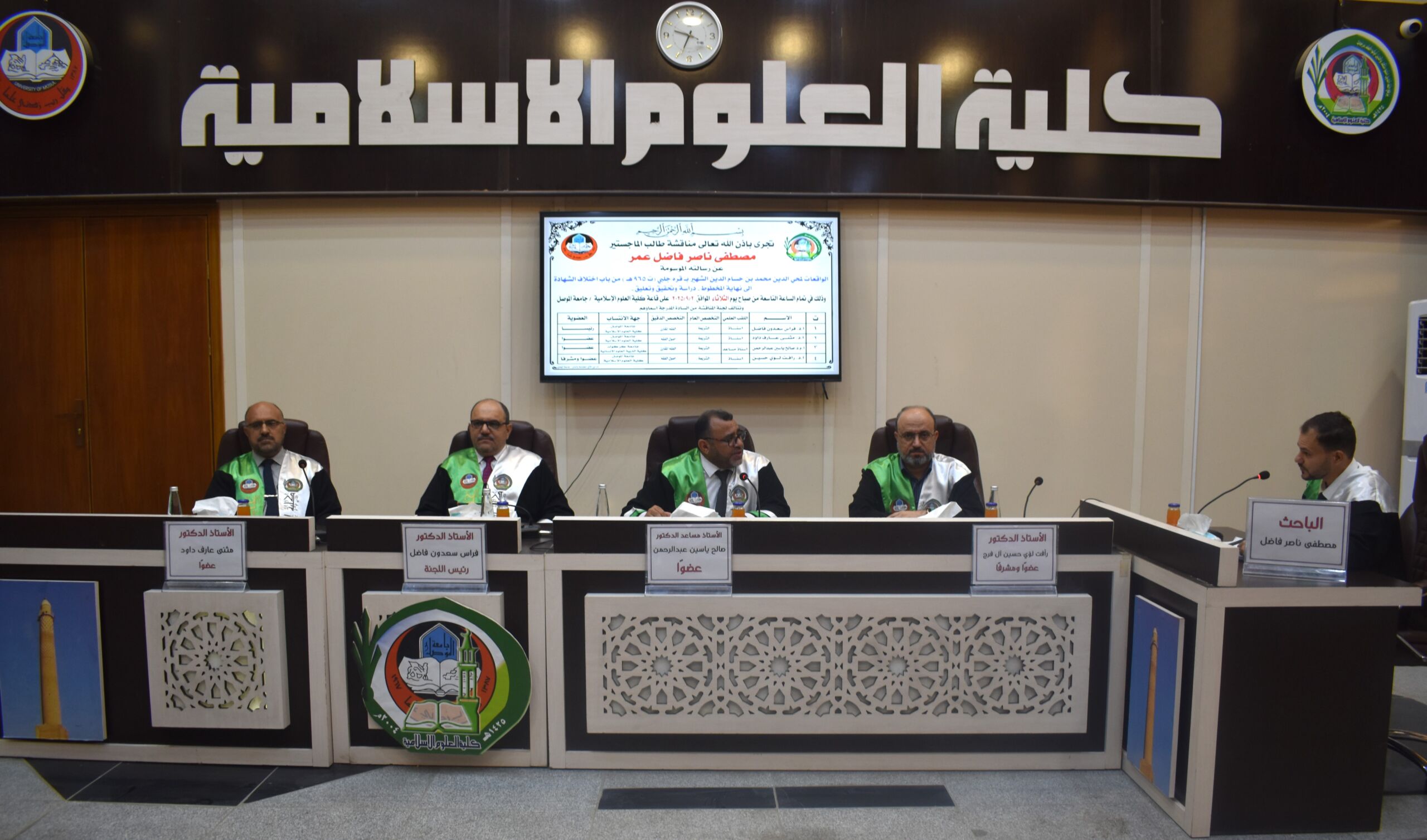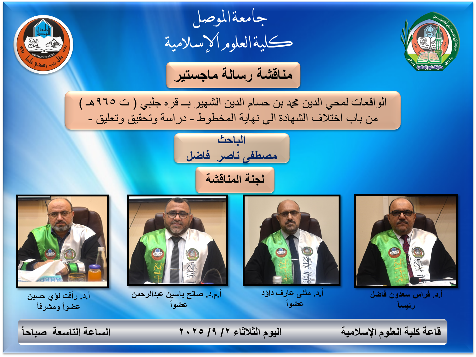نوقشت صباح هذا اليوم الثلاثاء الموافق 2/9/2025 في كلية العلوم الاسلامية – قسم الشريعة رسالة الماجستير الموسومة بـ ( الواقعات لمحي الدين محمد بن حسام الدين الشهير بــ قره جلبي( ت 965هـ ) من باب اختلاف الشهادة الى نهاية المخطوط – دراسة وتحقيق وتعليق – ) .