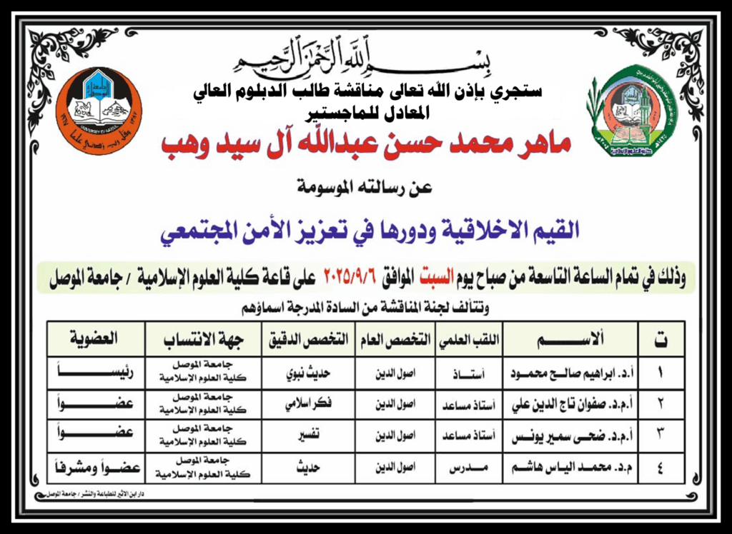 نوقشت صباح هذا اليوم الثلاثاء الموافق 2/9/2025 في كلية العلوم الاسلامية – قسم الشريعة رسالة الماجستير الموسومة بـ ( الواقعات لمحي الدين محمد بن حسام الدين الشهير بــ قره جلبي( ت 965هـ ) من باب اختلاف الشهادة الى نهاية المخطوط – دراسة وتحقيق وتعليق – ) .
