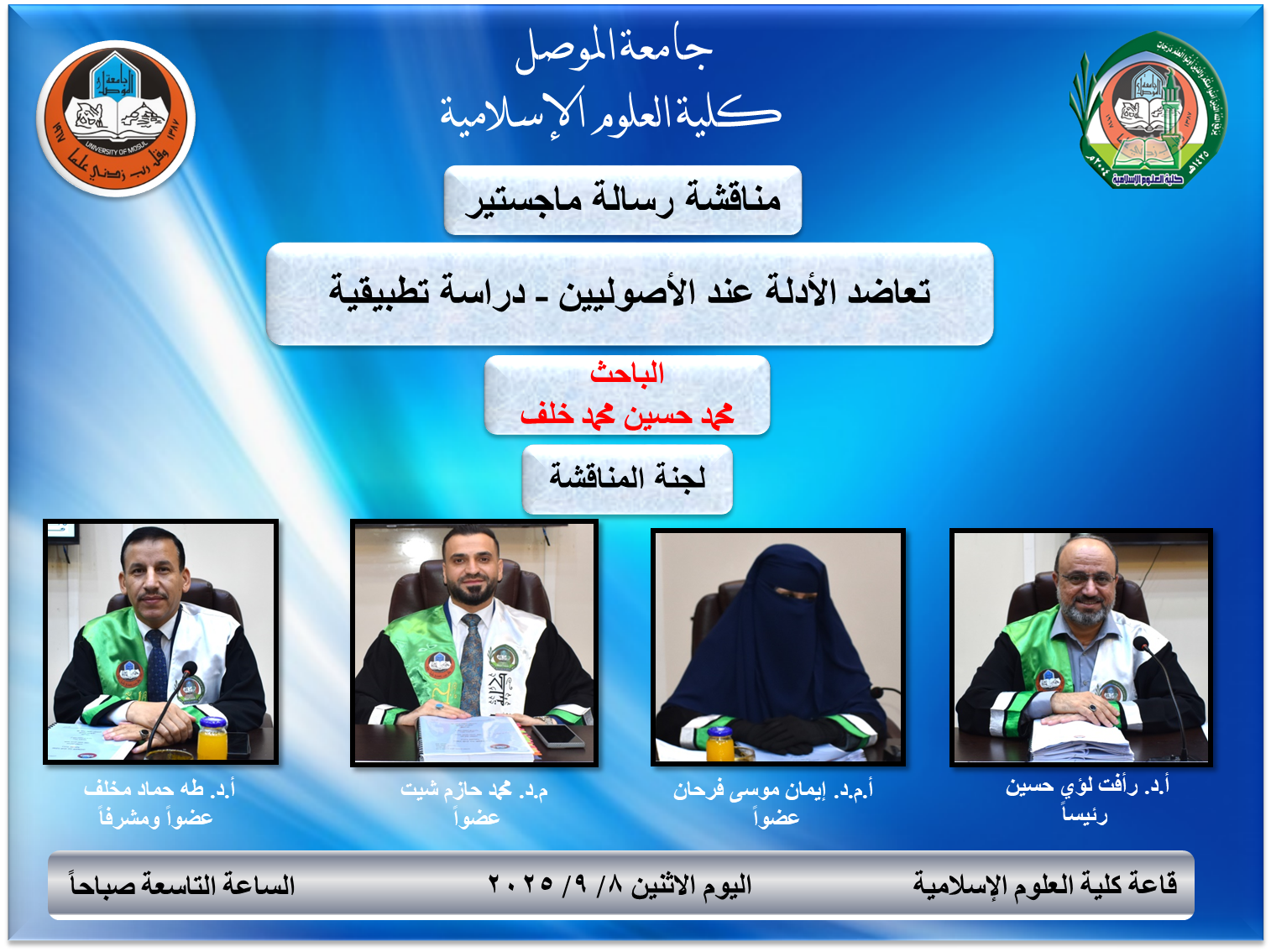 نوقشت  في كلية العلوم الإسلامية  – قسم  الشريعة  رسالة الماجستير الموسومة بـ ( تعاضد الأدلة عند الأصوليين دراسة تطبيقية ) .  للطالب ( محمد حسين محمد خلف) وبإشراف الأستاذ الدكتور ( طه حماد مخلف )  اليوم  الاثنين الموافق  ٨/ ٩ /٢٠٢٥.