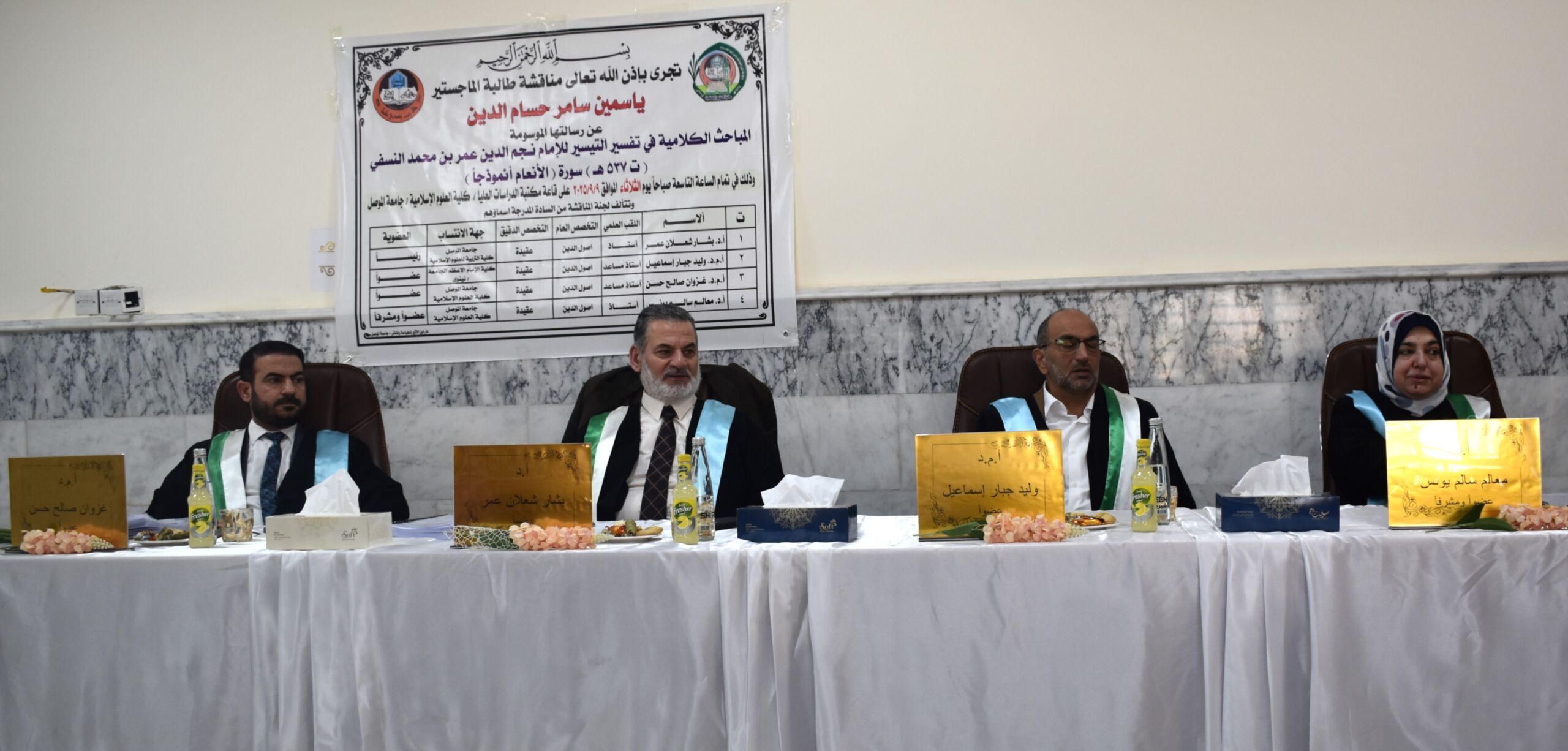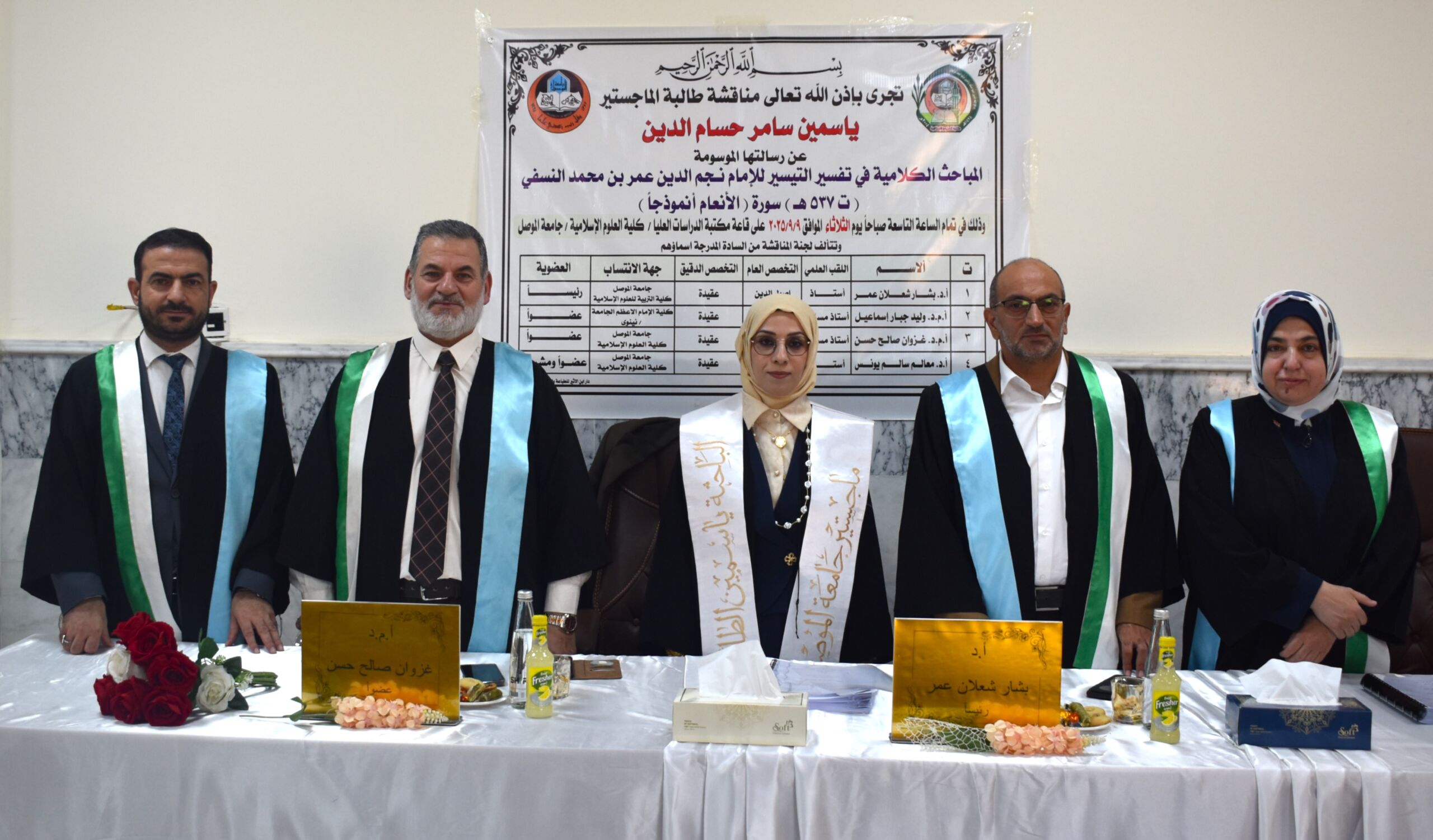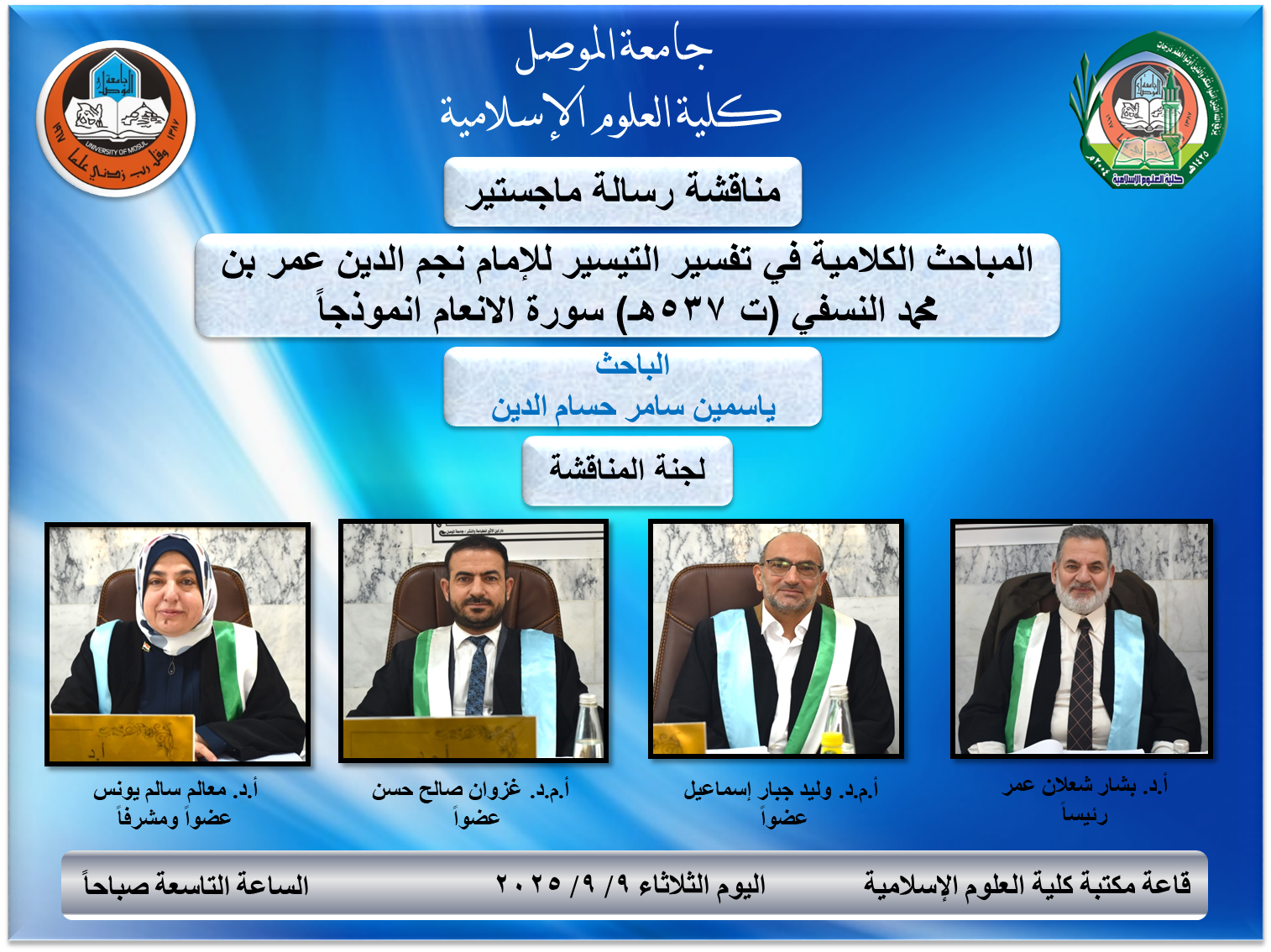 نوقشت في كلية العلوم الإسلامية – قسم العقيدة والفكر الإسلامي رسالة الماجستير الموسومة بـ ( المباحث الكلامية في ” تفسير التيسير ” للإمام نجم الدين عمر بن محمد النسفي ( ت 537 هـ ) سورة الأنعام أنموذجاَ ) . للطالبة (ياسمين سامر حسام الدين ) . وبإشراف الأستاذ الدكتورة (معالم سالم يونس). اليوم الثلاثاء الموافق 9/ 9 /2025 .