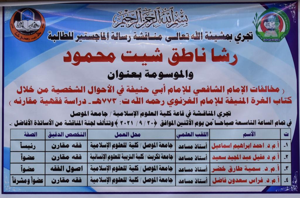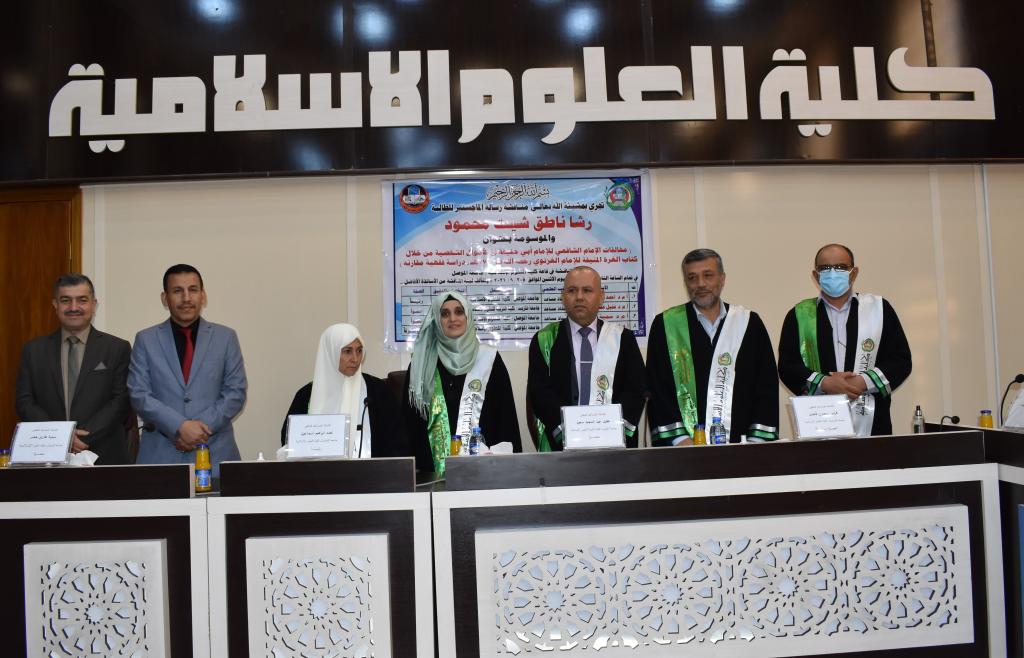 جرت صباح اليوم الاثنين الموافق 20/9/2021 في رحاب قاعة كلية العلوم الاسلامية مناقشة طالبة الماجستير في قسم الشريعة (رشا ناطق شيت محمود) في رسالتها الموسومة بـ (مخالفات الإمام الشافعي للإمام أبي حنيفة في الأحوال الشخصية من خلال كتاب الغُرة المُنيفة للإمام الغزنوي – رحمه الله- (ت:773هـ) – دراسة فقهية مقارنة). ترأس لجنة المناقشة الأستاذ المساعد الدكتور احمد إبراهيم إسماعيل.وعضوية كل من:الأستاذ المساعد الدكتور عقيل عبد المجيد سعيد، جامعة تكريتالأستاذ المساعد الدكتورة سمية طارق خضر الاحيدبالأستاذ المساعد الدكتور فراس سعدون فاضل عضواً ومشرفاً.بحثت الرسالة في بعض المسائل الفقهية الخلافية (الأحوال الشخصية تحديدا) بين علمين من أئمة الفقه، من خلال بيان منهجية الاستنباط الفقهي لكل منهما، وفق منهجية البحث الفقهي المقارن، المستند إلى الدليل وتوجيه الدليل، ودراسة حجية الاستنباطات الفقهية وأدلتها.كما تناولت الرسالة دراسة المسائل التي أوردها الإمام الغزنوي في كتابه (الغُرة المُنيفة في تحقيق بعض مسائل الإمام أبي حنيفة) في الأحوال الشخصية عن طريق ذكر المسألة، ثم بيان وجه الخلاف الفقهي بين الامامين أبي حنيفة والشافعي – رحمهما الله- في المسألة مدار البحث، يعقبه ذكر أقوال الفقهاء في المسألة ، ومن ثم تحرير الخلاف في المسألة وسببه والتأصيل له، فضلا عن ذكر أدلة كل قول ومناقشتها واخيرا ترجيح أحد الأقوال في المسألة مع بيان السبب.توصلت الرسالة إلى أن الله سبحانه وتعالى يسر لهذه الأمة علماء أعلام وأئمة أجلاء نذروا أنفسهم وأوقاتهم لخدمة ديننا الإسلامي الحنيف وعلومه الشريفة، ومن العلوم التي نالت نصيباً وافراً من البحث والاجتهاد من أولئك الأعلام البررة، علم الفقه، وللفقه أساطينه وأئمته اتفقوا على مسائل منه، واختلفوا في بعض جزئياته تبعًا لدليل أو توجيه دليل أو لسبب من أسباب الاختلاف الفقهي. تبارك عمادة كلية العلوم الإسلامية ورئاسة قسم الشريعة للباحثة ولمشرفها هذا الإنجاز العلمي المتميز.