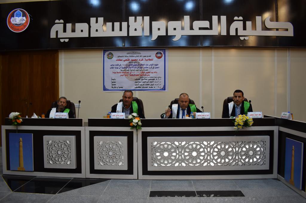 جرت صباح اليوم الخميس الموافق 3/12/2020 في رحاب قاعة كلية العلوم الاسلامية مناقشة طالبة الماجستير (كرم محمود فتحي مطلك) في رسالتها الموسومة بـ (مفهوم القياس عند الحطاب الرعيني المالكي ت954 في كتابه مواهب الجليل في شرح مختصر خليل من باب الاحوال الشخصية الى نهاية الكتاب) في قسم الشريعة . حيث ترأس لجنة المناقشة الاستاذ الدكتور عيسى صالح خلف وعضوية كل من الاستاذ المساعد الدكتور احمد ابراهيم اسماعيل والاستاذ المساعد الدكتور نبيل محمد غريب والاستاذ الدكتور طه حماد مخلف عضواً ومشرفاً. بحثت الرسالة مفهوم القياس عند احد اعمدة المذهب المالكي وهو الامام الحطاب رحمه الله تعالى كما تناولت الرسالة بعض التطبيقات الفقهية في هذا الكتابوتم قبول الرسالة بدرجة (مستوفي) تبارك عمادة كلية العلوم الاسلامية ورئاسة قسم الشريعة للباحثة ولمشرفها هذا الانجاز العلمي المتميز .