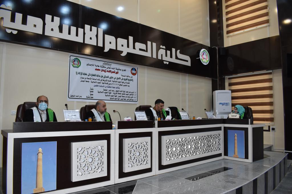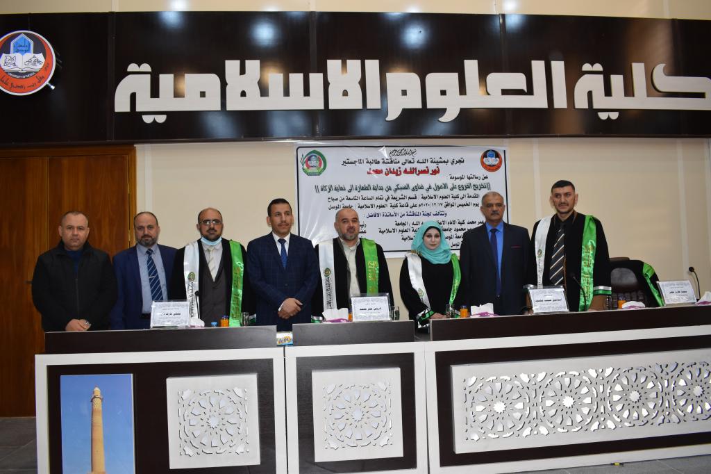 جرت صباح اليوم الخميس الموافق 17/12/2020 في رحاب قاعة كلية العلوم الاسلامية مناقشة طالبة الماجستير (نور نصر الله زيدان محمد) في رسالتها الموسومة بـ (تخريج الفروع على الاصول في فتاوى السبكي من بداية الطهارة الى نهاية الزكاة) في قسم الشريعة . حيث ترأس لجنة المناقشة الاستاذ الدكتور ادريس عمر محمد فارس وعضوية كل من الاستاذ الدكتور اسماعيل حبيب محمود والاستاذ المساعد الدكتور مثنى عارف داود والاستاذ المساعد الدكتورة سمية طارق خضر عضواً ومشرفاً. بحثت الرسالة مسائل تخريج الفروع على الاصول في فتاوى السبكي من بداية الطهارة الى نهاية الزكاة كما تناولت الرسالة المسائل التطبيقية التي ذكرها الامام السبكي وبيان وجه تخريج تلك المسائل والفروع على اصولها توصلت الرسالة الى أهمية علم تخريج الفروع على الاصول وربط علم أصول الفقه بالجانب العملي والتطبيقي تبارك عمادة كلية العلوم الاسلامية ورئاسة قسم الشريعة للباحثة ولمشرفتها هذا الانجاز العلمي المتميز .
