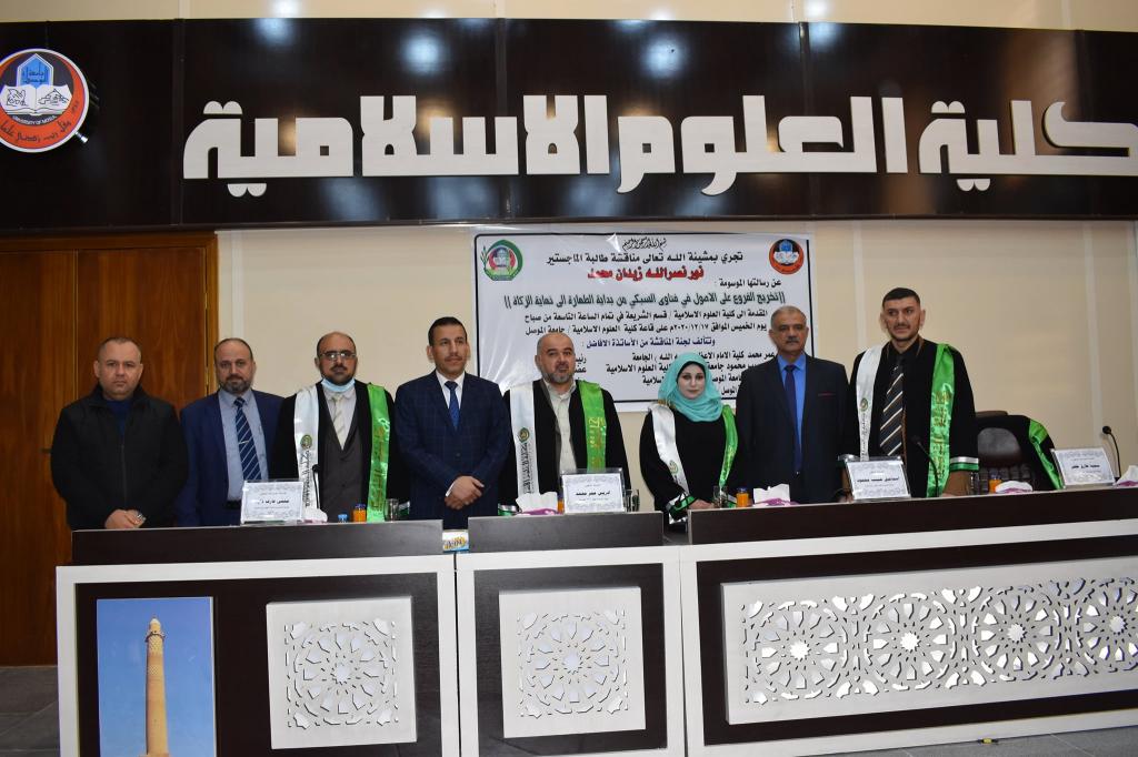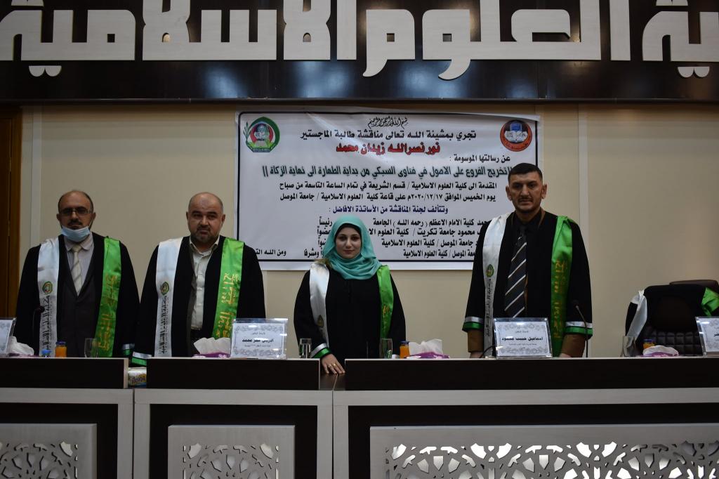 جرت صباح اليوم الخميس الموافق 17/12/2020 في رحاب قاعة كلية العلوم الاسلامية مناقشة طالبة الماجستير (نور نصر الله زيدان محمد) في رسالتها الموسومة بـ (تخريج الفروع على الاصول في فتاوى السبكي من بداية الطهارة الى نهاية الزكاة) في قسم الشريعة .حيث ترأس لجنة المناقشة الاستاذ الدكتور ادريس عمر محمد فارس وعضوية كل من الاستاذ الدكتور اسماعيل حبيب محمود والاستاذ المساعد الدكتور مثنى عارف داود والاستاذ المساعد الدكتورة سمية طارق خضر عضواً ومشرفاً.بحثت الرسالة مسائل تخريج الفروع على الاصول في فتاوى السبكي من بداية الطهارة الى نهاية الزكاةكما تناولت الرسالة المسائل التطبيقية التي ذكرها الامام السبكي وبيان وجه تخريج تلك المسائل والفروع على اصولهاتوصلت الرسالة الى أهمية علم تخريج الفروع على الاصول وربط علم أصول الفقه بالجانب العملي والتطبيقيتبارك عمادة كلية العلوم الاسلامية ورئاسة قسم الشريعة للباحثة ولمشرفتها هذا الانجاز العلمي المتميز .