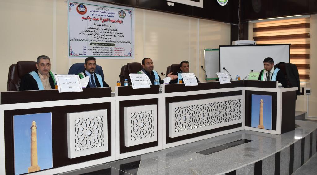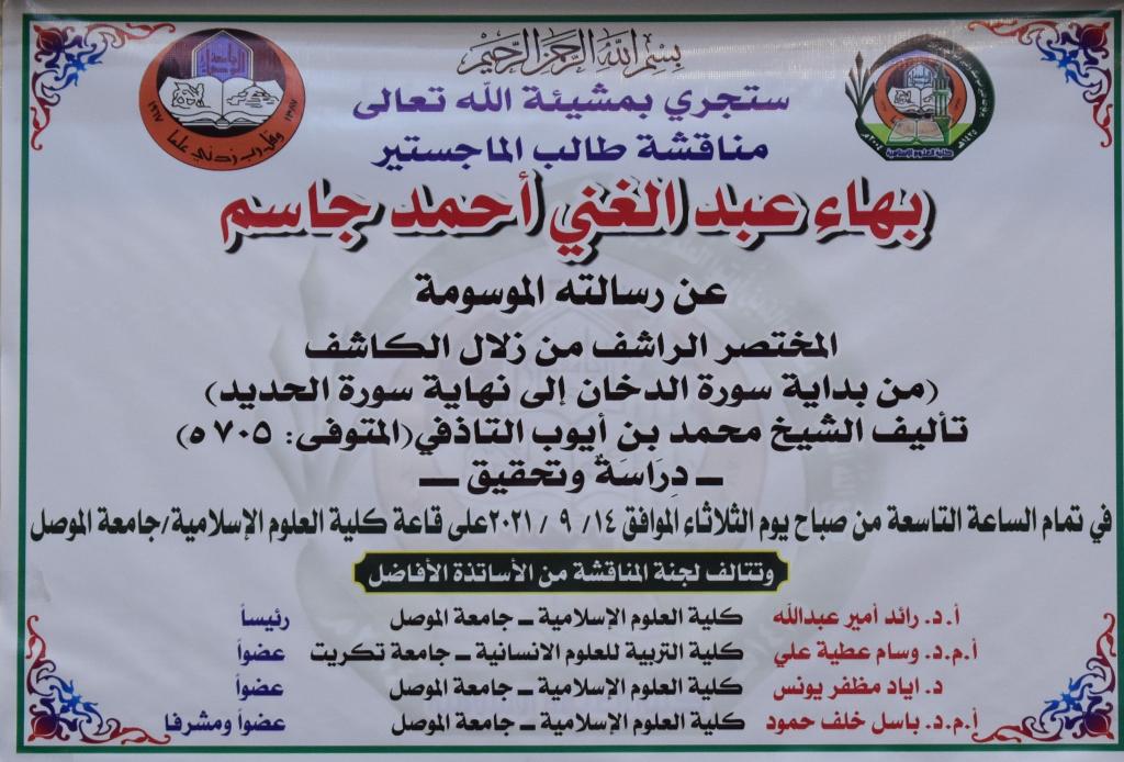 جرت صباح اليوم الثلاثاء الموافق 14/9/2021 في رحاب قاعة كلية العلوم الإسلامية مناقشة طالب الماجستير (بهاء عبد الغني أحمد جاسم) في قسم العقيدة والفكر الإسلامي عن رسالته الموسومة بـ (المختصر الراشف من زلال الكاشف من بداية سورة الدخان إلى نهاية سورة الحديد تأليف الشيخ محمد بن أيوب التاذفي (المتوفى 705هـ) – دراسة وتحقيق).حيث ترأس لجنة المناقشة الأستاذ الدكتور رائد أمير عبد الله وعضوية كل من الأستاذ المساعد الدكتور وسام عطية علي (جامعة تكريت) والدكتور أياد مظفر يونس والأستاذ المساعد الدكتور باسل خلف حمود عضواً ومشرفاً.بحثت الرسالة تحقيق هذا الجزء من المخطوط في تفسير القرآن الكريم للشيخ محمد بن أيوب التاذفي (المتوفى 705هـ) مع دراسة شخصية المؤلف (رحمه الله) .كما تناولت الرسالة عدد من الفصول والمباحث , وبيان أهمية هذا الكتاب الذي كان في أصله مخطوطاً .توصلت الرسالة إلى جهود المؤلف (رحمه الله) ومكانته العلمية من خلال كتابه (المختصر الراشف من زلال الكاشف ) . تبارك عمادة كلية العلوم الإسلامية ورئاسة قسم العقيدة والفكر الإسلامي للباحث ولمشرفه هذا الانجاز العلمي المتميز .