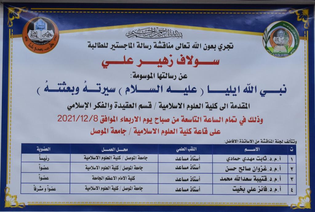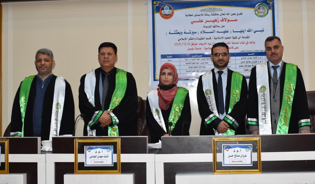 جرت صباح اليوم الأربعاء الموافق 8/12/2021 في رحاب قاعة كلية العلوم الإسلامية مناقشة طالبة الماجستير سولاف زهير علي في رسالتها الموسومة بـ (نبي الله إيليا _ عليه السلام _ سيرته وبعثته) في قسم العقيدة والفكر الاسلامي.حيث ترأس لجنة المناقشة الأستاذ المساعد ثابت مهدي حمادي وعضوية كل من الأستاذ المساعد الدكتور غزوان صالح حسن والأستاذ المساعد قتيبة سعد الله محمد والأستاذ الدكتور فائز علي بخيت عضواً ومشرفاً.بحثت الرسالة ان الخلق بحاجة للرسل ليبلغوهم ما يحبه الله ويرضاه وما يغضب منه وما يأباه وان كثيراً من العصاة والمنحرفين ضلوا في متاهات هذا مع وجود الأنبياء عليهم السلام فالرسل بعثوا يهذبون العباد ويخرجوهم من عبادة العباد الى عبادة رب العباد.تناولت الرسالة حياة نبي الله إيليا عليه السلام والقوم الذين بعث فيهم مظهرا عن بيان مفهوم النبوة عند اليهود واهم الأنبياء الذين أرسلوا إليهم وقد تناولت الرسالة ايضاً معجزات النبي إيليا عليه السلام . ومن أبرز ما توصلت له الرسالة عن مكانة النبوة واهميتها عند بني إسرائيل وكذلك بعث نبي الله إيليا عليه السلام الى بني إسرائيل اثناء حكم الملك آخاب وزوجته ايزابيل .تبارك عمادة كلية العلوم الإسلامية ورئاسة قسم العقيدة والفكر الاسلامي للباحثة ولمشرفها هذا الإنجاز العلمي المتميز .