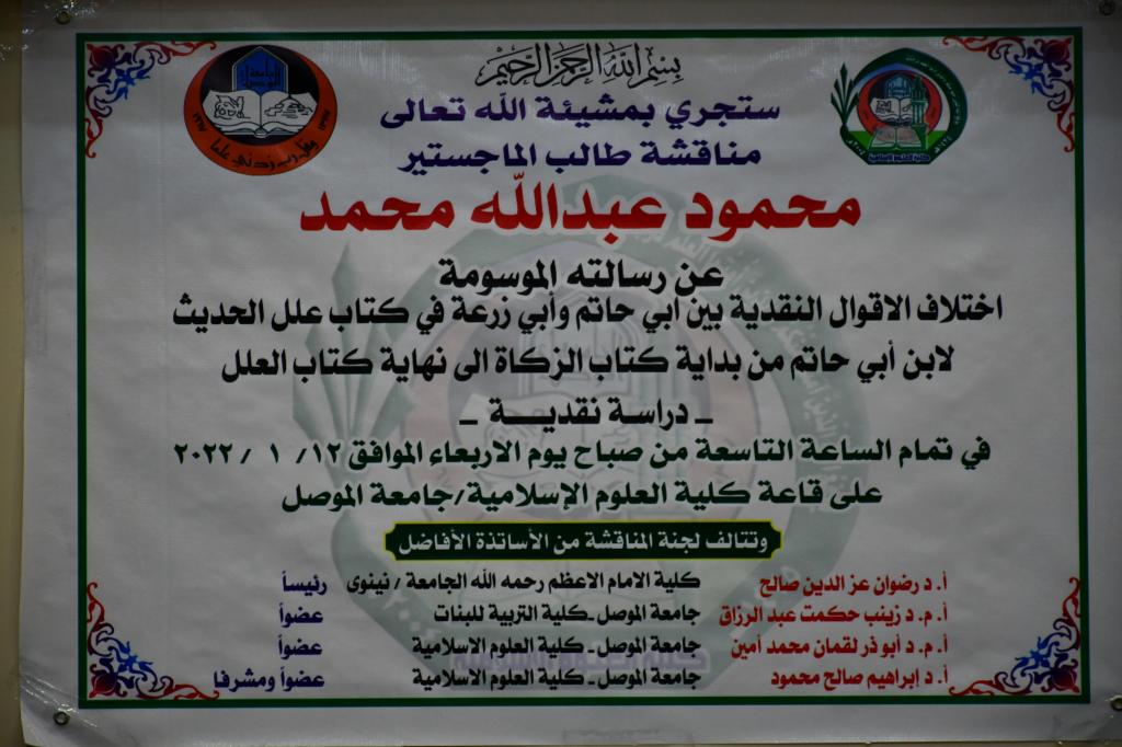 جرت صباح اليوم الاربعاء الموافق 12/1/2022 في رحاب قاعة كلية العلوم الإسلامية مناقشة طالب الماجستير محمود عبد الله محمد في رسالته الموسومة بـ (اختلاف الاقوال النقدية بين ابي حاتم وابي زرعة في كتاب علل الحديث لابن ابي حاتم من بداية كتاب الزكاة الى نهاية كتاب العلل – دراسة نقدية) في قسم العقيدة والفكر الاسلامي.حيث ترأس لجنة المناقشة الأستاذ الدكتور رضوان عز الدين صالح وعضوية كل من الأستاذ المساعد الدكتور زينب حكمت عبد الرزاق والأستاذ المساعد الدكتور أبو ذر لقمان محمد امين والأستاذ الدكتور إبراهيم صالح محمود عضواً ومشرفاً.بحثت الرسالة مسألة مهمة في علم العلل وهو أدق علوم الحديث فقد درست اختلاف الاقوال النقدية في تعليل الأحاديث بين الامام ابي حاتم وابي زرعة.تناولت الرسالة موضوعا علميا يبين الأهمية الكبيرة لهذا العلم ودقة المسائل العلمية وحرص العلماء على بيان العلل وإظهار الحديث سنداً ومتناً على اتم صورة.تبارك عمادة كلية العلوم الإسلامية ورئاسة قسم العقيدة والفكر الاسلامي للباحث ولمشرفه هذا الإنجاز العلمي المتميز.