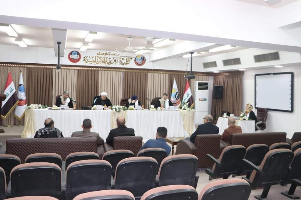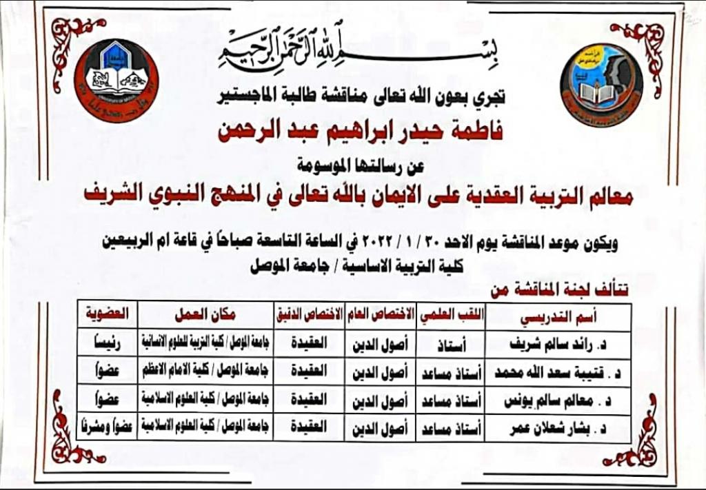 بإشراف الاستاذ المساعد الدكتور بشار شعلان عمر رئيس قسم العقيدة والفكر الإسلامي في كلية العلوم الاسلامية تمت مناقشة طالبة الدراسات العليا في كلية التربية الأساسية / جامعة الموصل فاطمة حيدر عبد الرحمن في رسالتها الموسومة (معالم التربية العقدية على الايمان بالله تعالى في المنهج النبوي الشريف) صباح اليوم الاحد الموافق 30/1/2022 في قاعة ام الربيعين .توصلت الرسالة إلى بيان المعالم التربوية الكريمة للنبي (صلى الله عليه وسلم) في تربية المسلمين على الإيمان بالله تعالى.. فقد تضمنت كل جزئية منها معلمًا مهمًا من معالم التربية العقدية..وقد شملت هذه المعالم قضايا الإيمان بالله تعالى والمتمثلة بالإيمان بوجود الله سبحانه ووحدانيته.. والإيمان بصفاته وأسمائه عز وجل.. إذ عمدت الطالبة إلى الأحاديث النبوية الشريفة واستقت منها المعالم التربوية العقدية الجليلة وبينت ما فيها من درر نبوية عظيمة مثلت المنهج النبوي الشريف في التربية العقدية على قضايا الإيمان بالله تعالى..وقد سادت المناقشة أجواء علمية رصينة..وأبدى الأساتذة المناقشون ملحوظاتهم العلمية المهمة التي تسهم في زيادة الرصانة العلمية للرسالة.. وقد حصلت الطالبة في المناقشة على درجة (جيد جدًا عالٍ).. فمبارك للطالبة وللمشرف وللجنة المناقشة هذا الإنجاز العلمي..