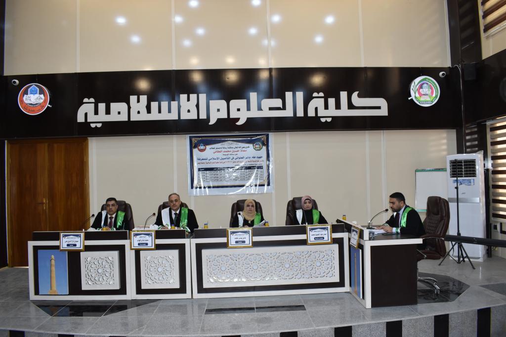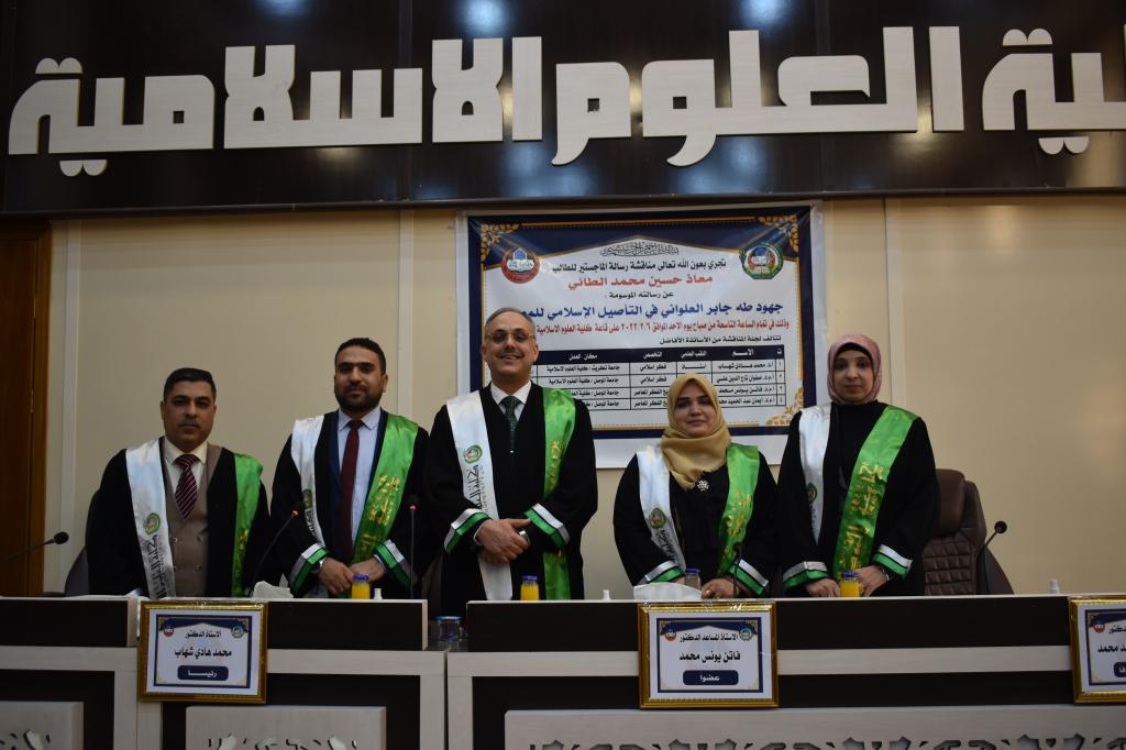 جرت صباح اليوم الاحد الموافق 6/2/2022 في رحاب قاعة كلية العلوم الإسلامية مناقشة طالب الماجستير معاذ حسين محمد في رسالته الموسومة بـ (جهود طه جابر العلواني في التأصيل الإسلامي للمعرفة) في قسم العقيدة والفكر الاسلامي.حيث ترأس لجنة المناقشة الأستاذ الدكتور محمد هادي شهاب وعضوية كل من الأستاذ المساعد الدكتور صفوان تاج الدين علي والأستاذ المساعد الدكتور فاتن يونس محمد والأستاذ المساعد الدكتور ايمان عبد الحميد محمد عضواً ومشرفاً.بحثت الرسالة طه جابر العلواني في التأصيل الإسلامي للمعرفة وجاء اهتمام المؤرخين بهذا الموضوع من اجل اخراج الامة الإسلامية من التبعية المعرفية والجمود الفكري، فدعوة التأصيل الإسلامي هي بناء نظام معرفي إسلامي معاصر يعمل على توجيه العلوم وجهة إسلامية وقراءتها بقراءتين قراءة الوحي المنظور أي (القرآن الكريم) وقراءة الكون والوجود المسطور.تناولت الرسالة في الفصل الأول الحياة الشخصية والعلمية لطه جابر العلواني من حيث النشأة والتحصيل الدراسي وحياته الوظيفية ومؤلفاته ومشاركاته في المؤتمرات والندوات، اما الفصل الثاني فقد جاء حول التأصيل الإسلامي للمعرفة من حيث المفهوم والضوابط والنشأة والتطبيق لاسيما تأسيس المعهد العالمي للفكر الإسلامي واهم رواده، اما الفصل الثالث فقد بحث في التأصيل الإسلامي للمعرفة عند طه جابر العلواني كفكرة ومشروع وعلاقتها بالمنهجية القرآنية والسنة والفقه والفكر الاسلامي. توصلت الرسالة الى أهمية التأصيل الإسلامي في اصلاح مناهج الفكر لدى المسلمين وهي خطوة يخطوها المفكرون نحو النهوض بالعقل المسلم وإعادة ترتيب موازينه وأولوياته وقد ركز العلواني في عملية التأصيل الإسلامي للمعرفة على تفعيل قواعد العقيدة الإسلامية معرفيا وتحويلها الى طاقة معرفية مبدعة وعلى كشف الانساق او النماذج المعرفية التي سادت في التاريخ الإسلامي ودعا العلواني الى نقل العقل المسلم من الانشغال في الجزئيات الى الكليات ومن التقليد والتبعية الى الابداع والاصالة.وقد تشرفت الكلية بزيارة الأستاذ الدكتور عماد الدين خليل الى وقائع المناقشة فازدادت بحضوره بهاءً وسناءً.تبارك عمادة كلية العلوم الإسلامية ورئاسة قسم العقيدة والفكر الاسلامي للباحث ولمشرفه هذا الإنجاز العلمي المتميز.