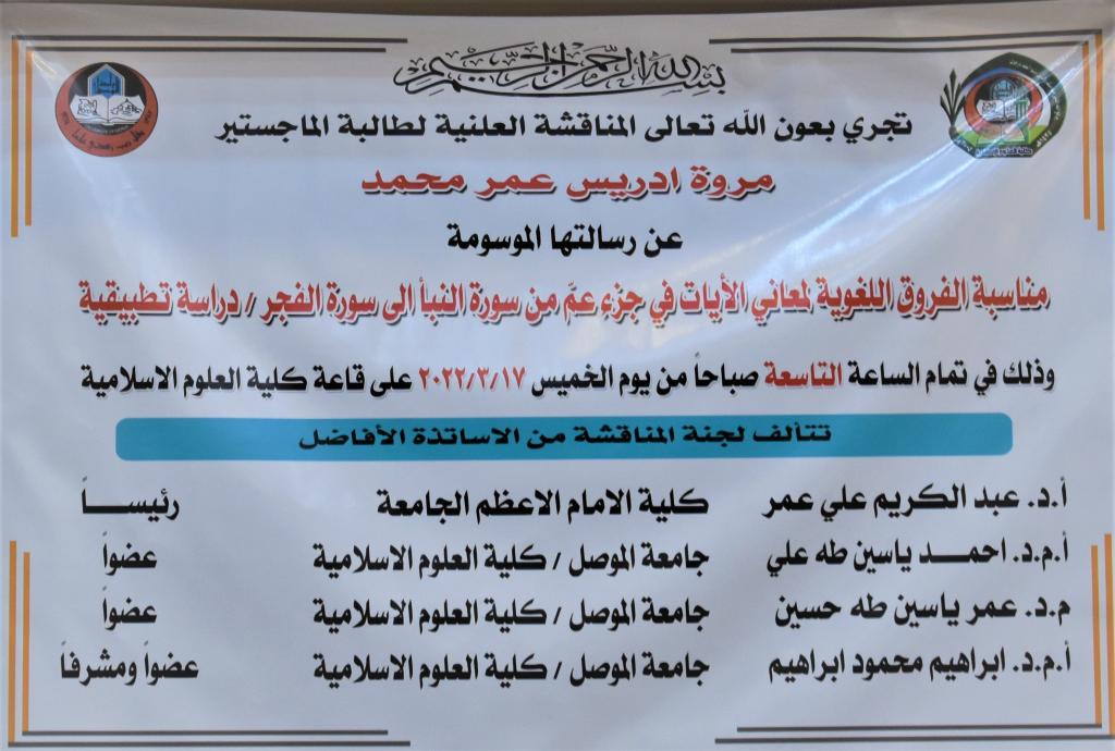 تم مناقشة رسالة ماجستير في كلية العلوم الاسلامية عن (مناسبة الفروق اللغوية لمعاني الآيات في جزء عم من سورة النبأ الى سورة الفجر/ دراسة تطبيقية)، يوم الخميس الموافق 17/3/2022 ،وقد حضر جانبا منها الاستاذ الدكتور طه حماد مخلف عميد الكلية والاستاذ الدكتور رأفت لؤي حسين معاون العميد للشؤون العلمية والدراسات العليا ورئيس القسم الدكتور بشار شعلان عمر وعدد من تدريسيي الكلية.تناولت الرسالة التي تقدمت بها الطالبة (مروة ادريس عمر محمد) في قسم العقيدة والفكر الإسلامي المباحث العلمية المتعلقة بدلالة الالفاظ القرآنية وما يقابلها من الفاظ الفروق التي تتقارب من حيث المعنى، ثم تحدثت عن مناسبة اللفظ القرآني للسياق القرآني المعجز وأشارت الى ابعاد هذا الاعجاز البياني الذي هو أحد اهم اقسام علم البلاغة وأوضحت المعنى الإجمالي لكل سياق قرآني ورد وفسرت معناه بسلاسة. توصلت الرسالة الى ان القرآن الكريم متعدد الاعجاز وان اهم اعجاز فيه هو الاعجاز البياني الذي يوضح دقة التعبير القرآني وشمول لفظه لاهم المعاني واحتوائه على الدلالات التي من اجلها ورد النص ضمن سياق متناسق بحيث لو أبدل لفظ مكان لفظ مع التقارب في المعنى لاختل السياق القرآني .ترأس لجنة المناقشة الأستاذ المساعد الدكتورعبد الكريم علي عمر/ كلية الامام الأعظم وعضوية كل من الاستاذ المساعد الدكتور احمد ياسين طه والاستاذ المساعد الدكتور عمر ياسين طه حسين، وبإشراف وعضوية الأستاذ المساعد الدكتور إبراهيم محمود ابراهيم. تبارك عمادة الكلية ورئاسة القسم للباحثة ولمشرفها هذا الانجاز العلمي المتميز.