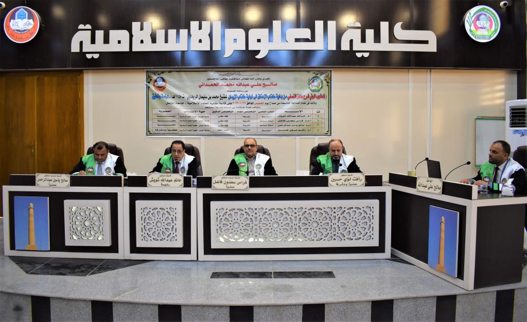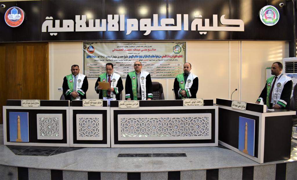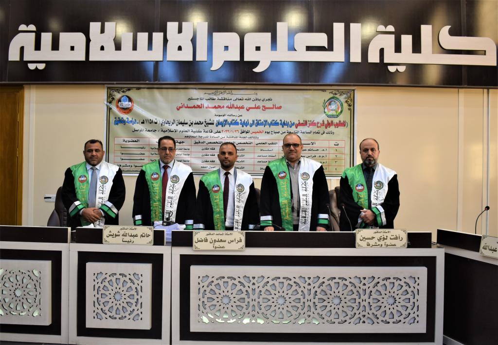 نوقشت هذا اليوم الخميس الموافق 26/1/2023 في كلية العلوم الإسلامية بجامعة الموصل رسالة الماجستير الموسومة (المطلوب الوفي شرح كنز النسفي من بداية كتاب الاعتاق الى نهاية كتاب الايمان للشيخ محمد بن سليمان الريحاوي ت:1158هـ – دراسة وتحقيق)، حضر جانبا منها الاستاذ الدكتور طه حماد مخلف عميد الكلية والاستاذ المساعد الدكتور ثابت مهدي حمادي المعاون الإداري وعدد من التدريسيين.تناولت الرسالة التي تقدم بها الطالب (صالح علي عبد الله محمد) في قسم الشريعة التعريف بحياة الشيخ الريحاوي الشخصية والعلمية وبيان جهوده في هذا الكتاب الفقهي القيم وإظهار التفصيلات الفقهية المتعلقة ببعض أبواب المعاملات . تطرقت الرسالة إلى تحقيق ما يتعلق بكتاب الاعتاق وكتاب الايمان ومحاولة اخراجه كما اراده مؤلف الكتاب.توصلت الرسالة إلى ان الريحاوي له جهد كبير في عرض اراء الفقهاء الحنفية من المتقدمين والمتأخرين والاستدلال عليها.ترأس لجنة المناقشة الأستاذ الدكتور (حاتم عبد الله شويش) وعضوية كل من الأستاذ المساعد الدكتور (فراس سعدون فاضل) والأستاذ المساعد الدكتور (صالح ياسين عبد الرحمن)، وبإشراف وعضوية الأستاذ الدكتور (رأفت لؤي حسين). تبارك عمادة الكلية ورئاسة القسم للباحث ولمشرفه هذا الانجاز العلمي المتميز.