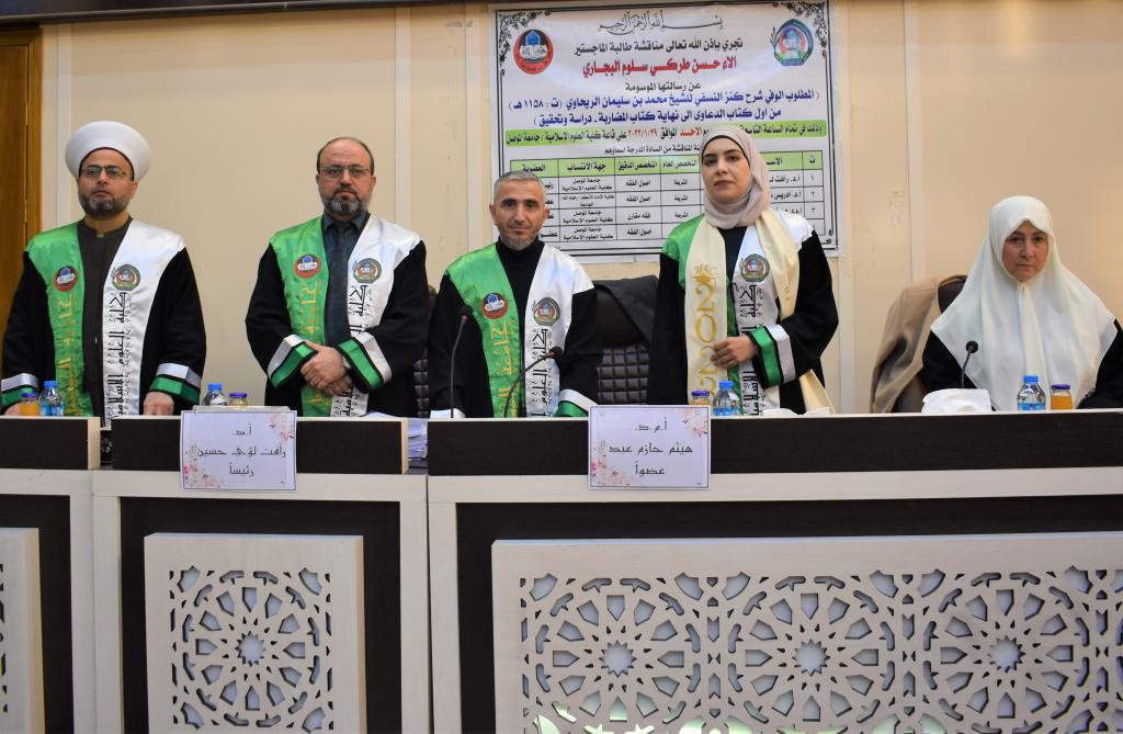 نوقشت هذا اليوم الأحد الموافق 29/1/2023 في كلية العلوم الإسلامية بجامعة الموصل رسالة الماجستير الموسومة (المطلوب الوفي شرح كنز النسفي للشيخ محمد بن سليمان الريحاوي ت:1158هـ من اول كتاب الدعاوى الى نهاية كتاب المضاربة – دراسة وتحقيق)، حضر جانبا منها الاستاذ الدكتور طه حماد مخلف عميد الكلية وعدد من التدريسيين.تناولت الرسالة التي تقدمت بها الطالبة (الاء حسن طركي سلوم) في قسم الشريعة ترجمة الامام النسفي والشيخ الريحاوي رحمهما الله مع ذكر المصادر التي اعتمدها الشيخ الريحاوي ثم وصف المخطوط وتحقيقه.تطرقت الرسالة إلى موضوع الدعاوى حيث تناولت الاحكام المتعلقة بها وما ينبغي فعله من قبل الخصمين في رفع الدعاوى كذلك ما يتعلق بالقاضي من أحكامتوصلت الرسالة أهمية تحقيق المخطوطات الفقهية لما لها من أثر كبير في إثراء تراثنا الفقهي ولما تتناوله من قضايا يحتاجها المجتمع في واقعنا المعاصرترأس لجنة المناقشة الأستاذ الدكتور (رأفت لؤي حسين) وعضوية كل من الأستاذ الدكتور (ادريس عبد الله محمد) والأستاذ المساعد الدكتور (هيثم حازم عبد)، وبإشراف وعضوية الأستاذ المساعد الدكتورة (سمية طارق خضر). تبارك عمادة الكلية ورئاسة القسم للباحثة ولمشرفتها هذا الانجاز العلمي المتميز.