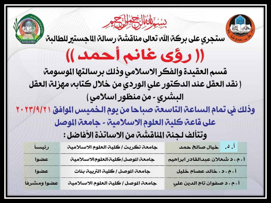 ترأس لجنة المناقشة الأستاذ الدكتور (شعلان عبدالقادر إبراهيم) وعضوية كل من الأستاذ المساعد الدكتورة (رحاب نذير محمد) والأستاذ المساعد الدكتور (طه عبدالله محمد) وبإشراف وعضوية الأستاذ المساعد الدكتور (صفوان تاج الدين علي).