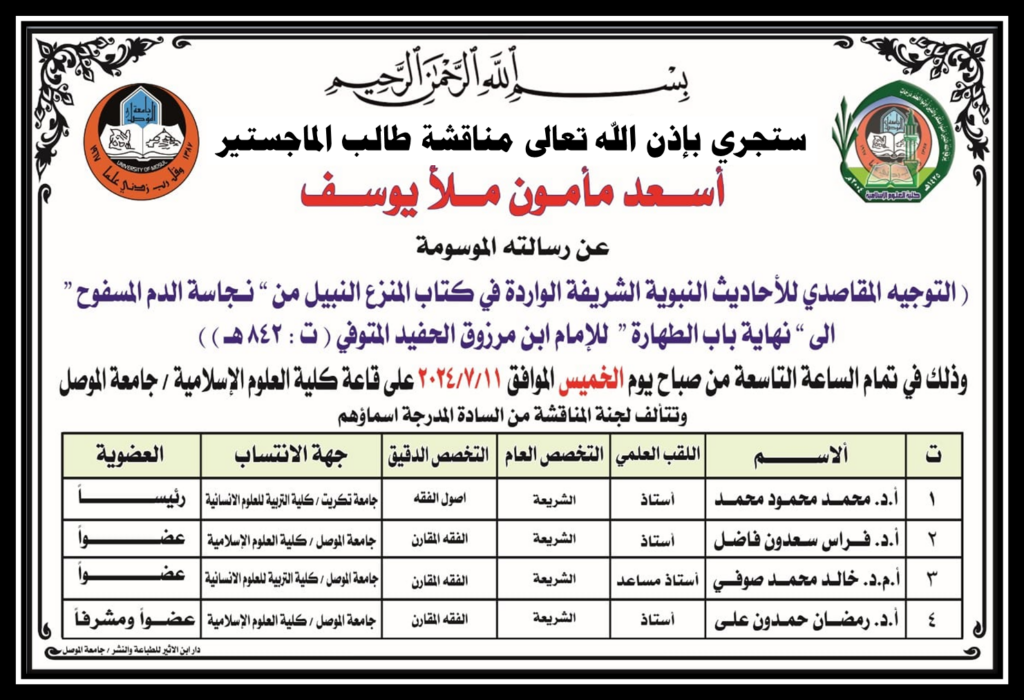 نوقشت هذا اليوم الأربعاء الموافق 10/7/2024 في كلية العلوم الإسلامية بجامعة الموصل رسالة الماجستير الموسومة (الترجيحات الأصولية للأمام بدر الدين الزركشي ت:794هـ في كتابه سلاسل الذهب – دراسة مقارنة – ) في قسم الشريعة .