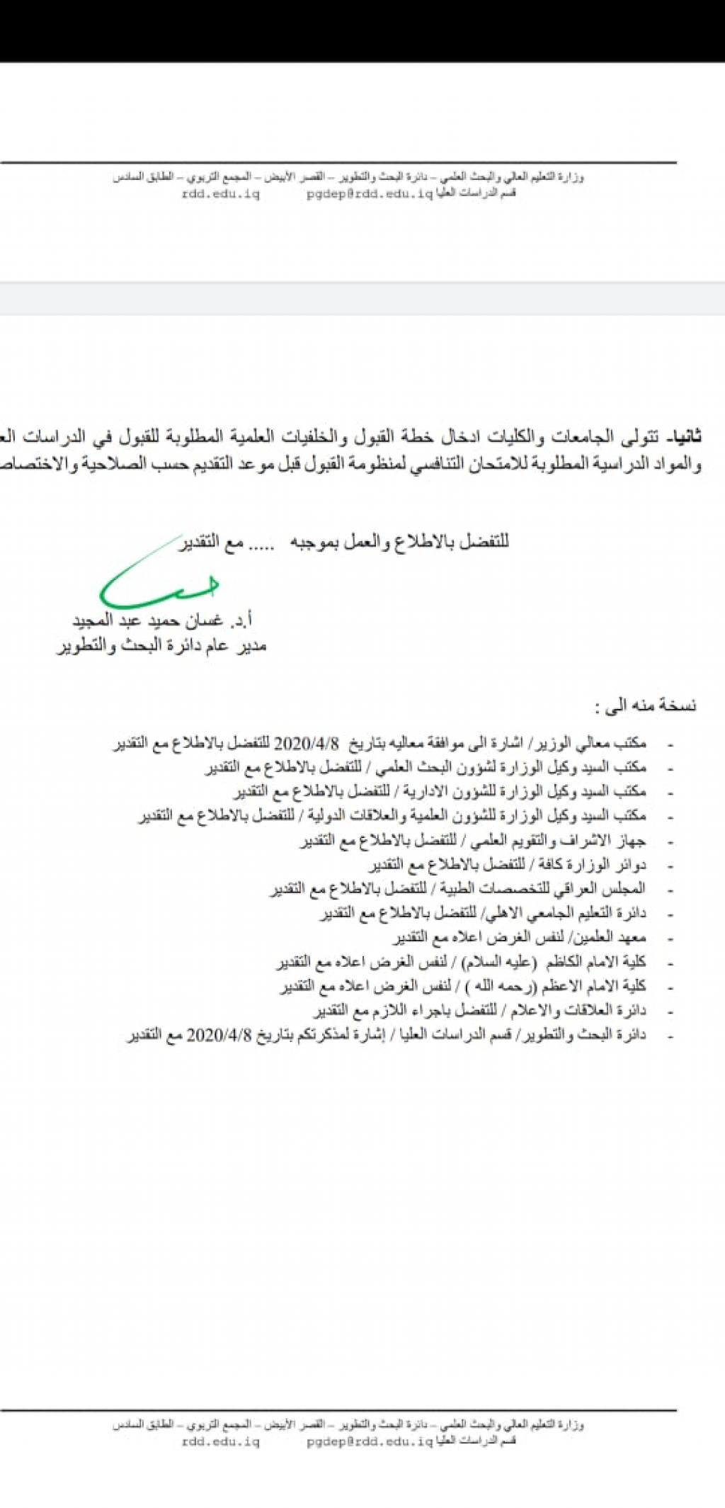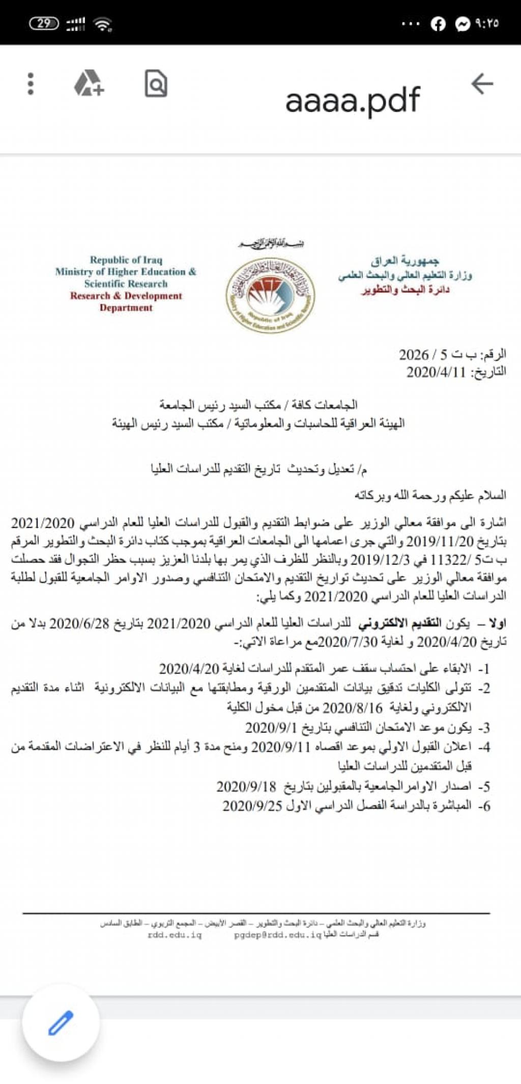 بالنظر للظرف الذي يمر به بلدنا العزيز بسبب جائحة كورونا وتمديد حظر التجوال فقد حصلت موافقة معالي الوزير على تحديث تواريخ التقديم والامتحان التنافسي وصدور الاوامر الجامعية لقبول طلبة الدراسات العليا للعام الدراسي 2020-2021 وكما مبين في الكتاب الصادر من وزارة التعليم العالي والبحث العلمي دائرة البحث والتطوير بتاريخ 11/4/2020