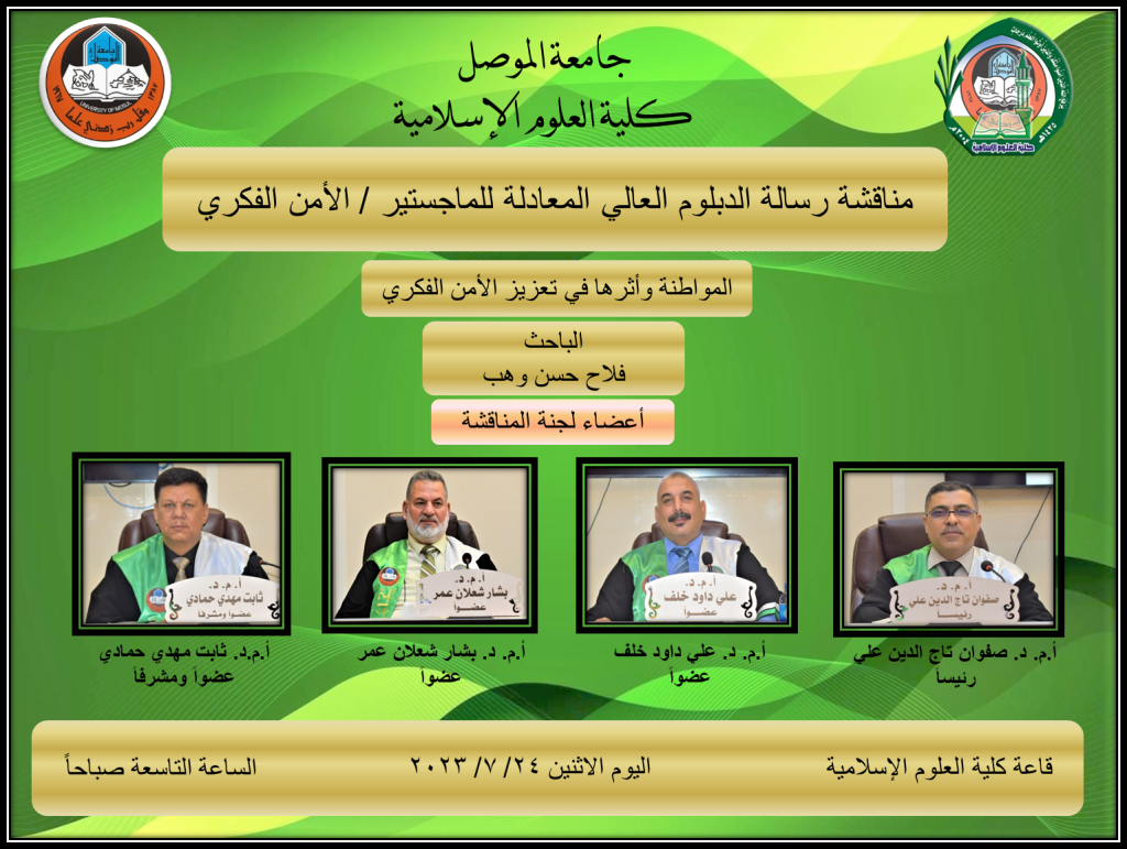 حيث تألفت لجنة المناقشة (أ.د. معالم سالم يونس) وعضوية كل من (أ.د. رحيم سلوم مرهون) و (أ.م. د. بشار شعلان عمر)، وبإشراف وعضوية (أ.م. د. غزوان صالح حسن).