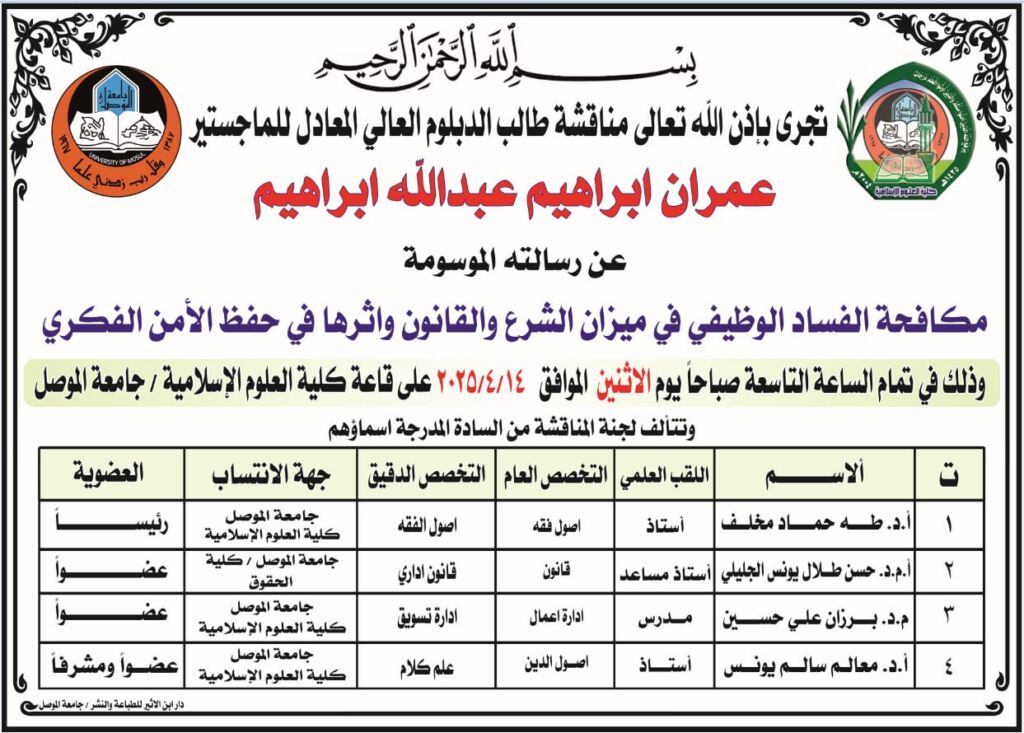 موعد مناقشة رسالة دبلوم عالي معادل للماجستير