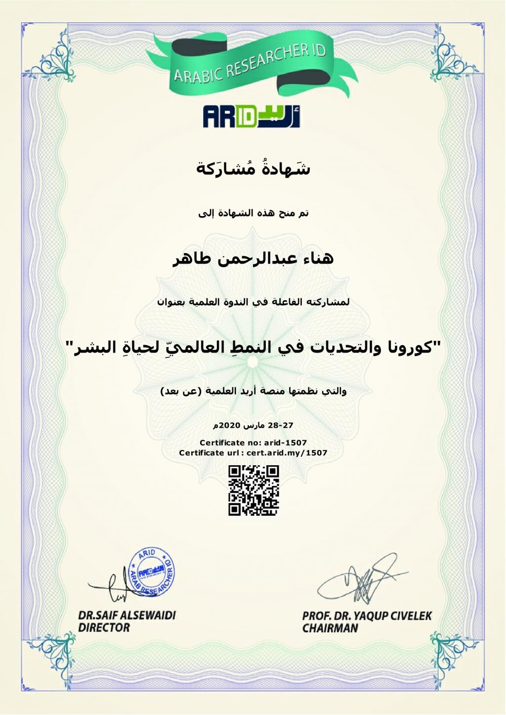 ندوة علمية عن كوروناشاركت المدرس المساعد هناء عبد الرحمن الأستاذة في كلية العلوم الإسلامية قسم الحديث وعلومه في الندوة العلمية التي أقامتها منصة أريد والموسومة (كورونا والتحديات في النمط العالمي لحياة البشر )وتثمن عمادة الكلية هذه المساهمات العلمية الهادفة وتدعو إلى المزيد من المشاركات الفعالة في خدمة المجتمع.