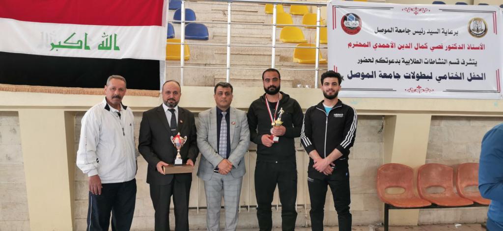 بمناسبة يوم تأسيس جامعة الموصل (54) أقام قسم النشاطات الطلابية عدة فعاليات رياضية (الماراثون وكرة قدم الصالات للأساتذة وتنس المنضدة وتنس ارضي) وتم تكريم المشاركين في جميع الفعاليات بحضور الدكتور باسل خلف حمود رئيس نقابة الأكاديميين في نينوى والدكتور رأفت لؤي آل فرج معاون العميد للشؤون العلمية والطلبة ممثلا عن الكلية والدكتور إسماعيل جبار مسؤول شعبة النشاطات الطلابية في الكلية..وتم تكريم الكلية من قبل الاستاذ الدكتور نبراس يونس آل مراد مسؤول قسم النشاطات الطلابية في جامعة الموصل..وقد حصل الطالب (عبد الله أحمد علي) في المرحلة الرابعة بقسم الشريعة على المركز الثالث فعالية التنس الطاولة.. وبذلك تهنئ عمادة كلية العلوم الإسلامية هذا الفوز والنجاح للطالب أحمد وللدكتور اسماعيل والاستاذ وسيم على متابعتهم الحثيثة واهتمامهم الكبير في نجاح النشاطات الرياضية في الكلية.