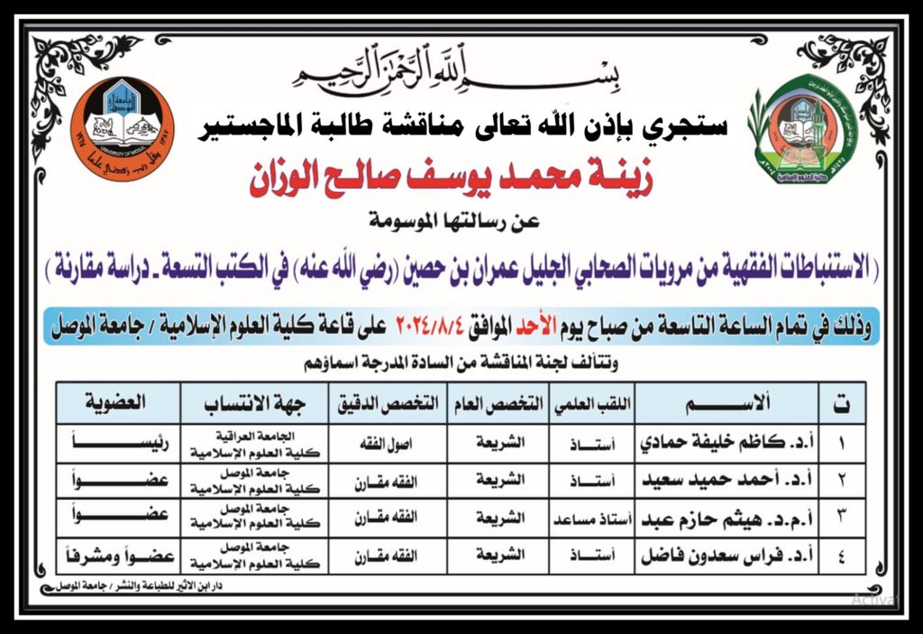 تشرفت كلية العلوم الاسلامية بجامعة الموصل اليوم الاربعاء الموافق 31/7/2024 بزيارة لجنة من مجلس الاعتماد البرامجي الوطني برئاسة الاستاذ الدكتورة كفاح صابر رشيد وعضوية كل من الدكتور ابراهيم ثابت نصار والدكتور خالد عيفان اسماعيل وكان في استقبالهم السيد عميد كلية العلوم الاسلامية الاستاذ الدكتور طه حماد مخلف وعضو مجلس الاعتماد الوطني البرامجي الاستاذ المساعد الدكتور ثابت مهدي حمادي.