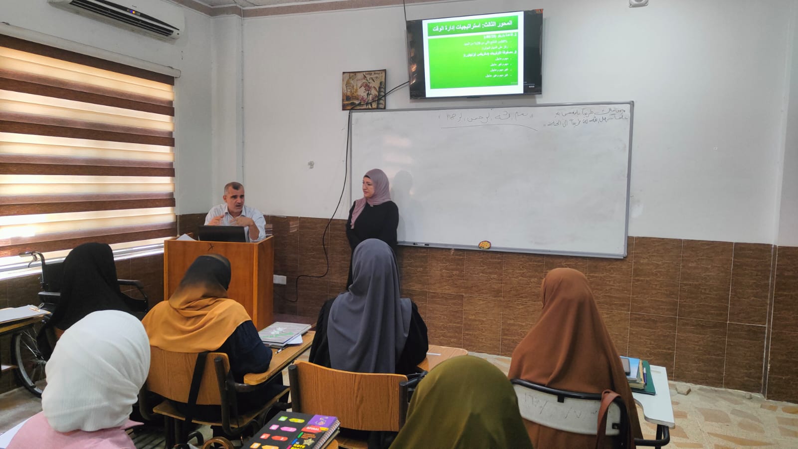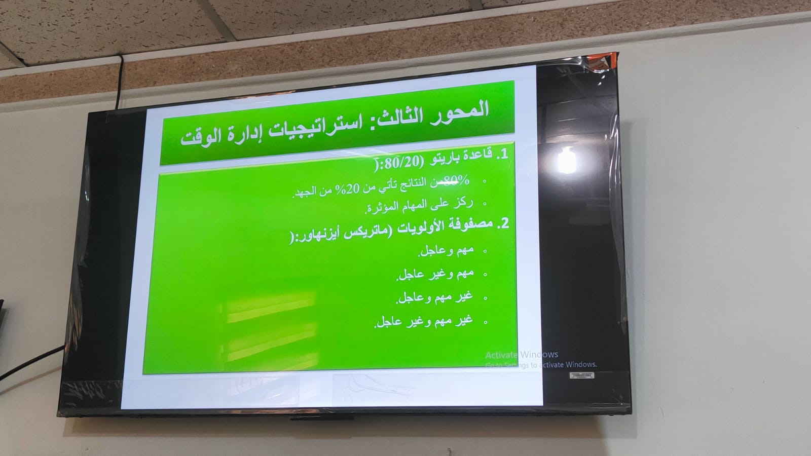 ورشة بعنوان (مهارات ادارة الوقت ). تناولت الورشة الخاصة بموضوع المهارات التخصصية/ مهارات ادارة الوقت اهمية ادارة الوقت والهدف من ذلك، المحور الأول الخاص بأهمية ادارة الوقت والغاية من ذلك . أما المحور الثاني: معوقات ادارة الوقت. واخيرا وليس إخرا تناول المحور الثالث:استراتيجات ادارة الوقت .