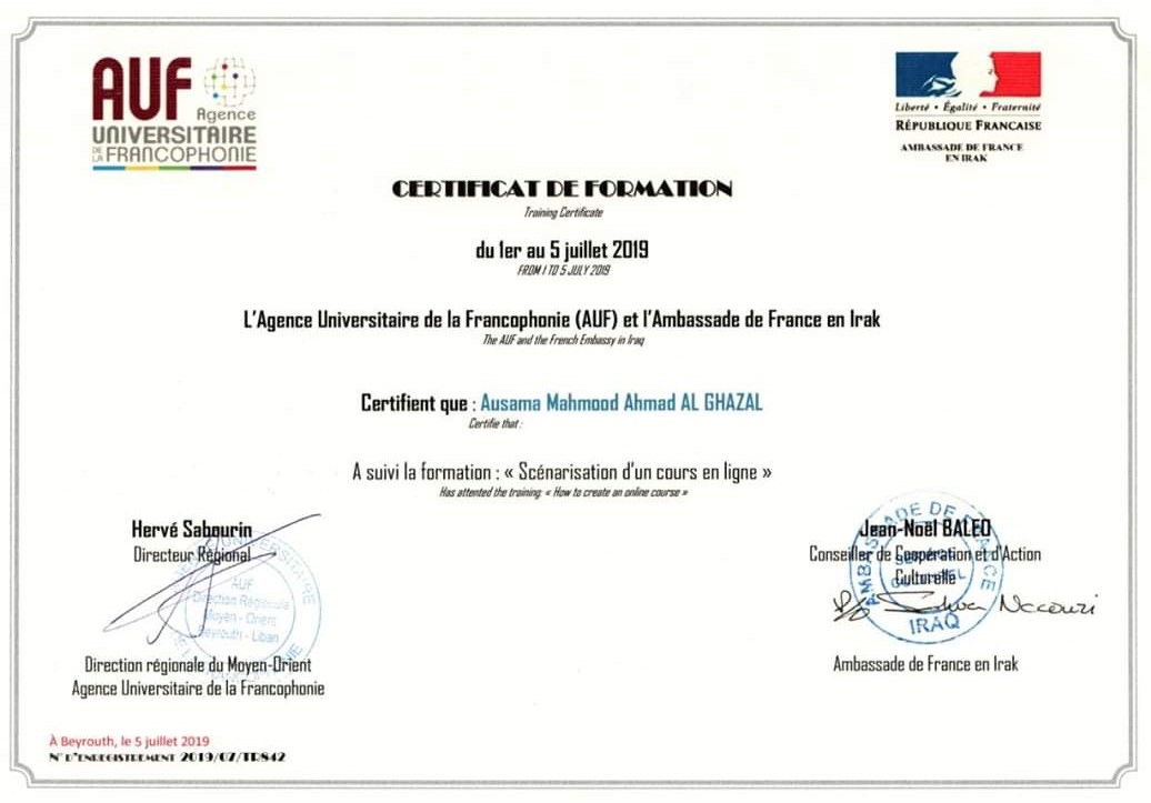 admin_omar2025-07-22T12:34:48+03:00أختتمت يوم الجمعة الماضي أعمال الدورة الأولى لاستخدام التقنيات الرقمية في الصف الدراسي ضمن إطار برنامج التعاون العلمي والثقافي والمعرفي بين جامعة الموصل والوكالة الجامعية الفرانكوفونية برعاية السفارة الفرنسية في جمهورية العراق والجمهورية اللبنانية والتي أقيمت في بيــــروت للفتــــرة من 1– 5 تموز2019 , وقد كان أحد المشاركين في الدورة السيد أسامة محمود أحمد رئيس مبرمجين أقدم مسؤول وحدة الموقع الالكتروني /شعبة الإعلام والعلاقات العامة في كليتنا وقد حصل على شهادة دولية في الدورة .