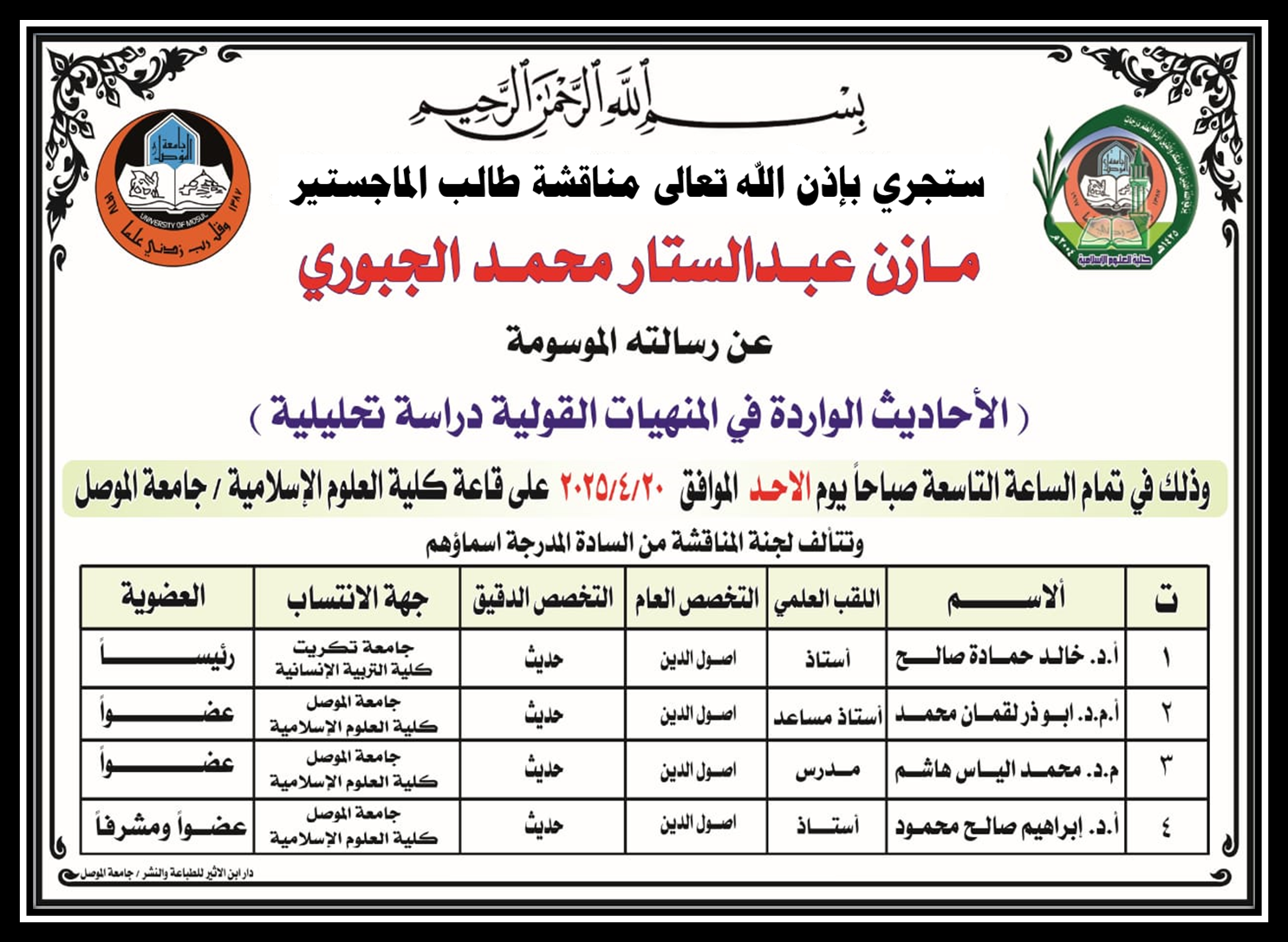 ausamaalghazal2025-12-16T12:28:44+03:00ضمن النشاطات الثقافية في قسم الحديث وعلومه اقيم يوم الإثنين الموافق ١٥/ ١٢/ ٢٠٢٥ مجالس سماع الحديث الشريف لقراءة كتاب ثلاثيات الامام البخاري (رحمه الله) في قسم الحديث وعلومه وأجاز الدكتور ابوذر لقمان الحبار الحاضرين بالسند المتصل للإمام البخاري صاحب الكتاب.