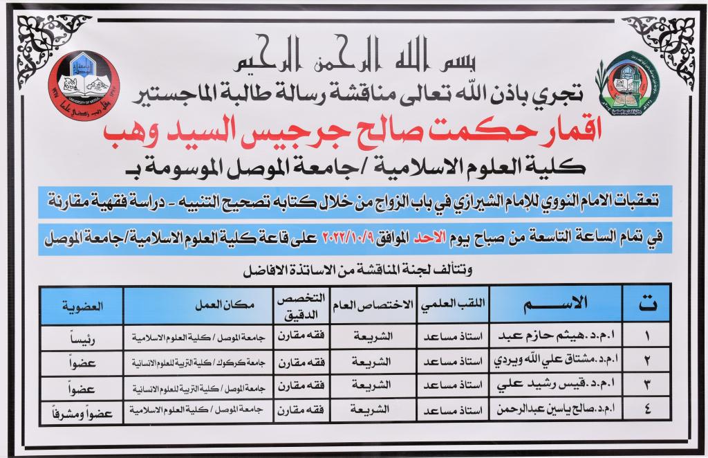 ناقشت كلية العلوم الإسلامية بجامعة الموصل رسالة الماجستير الموسومة (تعقبات الامام النووي للإمام الشيرازي في باب الزواج من خلال كتابه تصحيح التنبيه – دراسة فقهية مقارنة)، يوم الأحد الموافق 9/10/2022، حضر جانبا منها الاستاذ الدكتور رأفت لؤي حسين معاون العميد للشؤون العلمية والأستاذ المساعد الدكتور ثابت مهدي حمادي معاون العميد للشؤون الإدارية وعدد من تدريسيي الكلية.تناولت الرسالة التي تقدمت بها الطالبة (أقمار حكمت صالح جرجيس) في قسم الشريعة الى تعقبات الامام النووي للإمام الشيرازي رحمهما الله في الزواج من خلال كتابه تصحيح التنبيه وإخراج الرأي الراجح المعمول به في مذهب الامام الشافعي رحمه اللهتوصلت الدراسة الى ان كتاب التنبيه وتصحيح التنبيه من الكتب المعتبرة في الفقه الشافعي وان الامام النووي وافق الامام الشيرازي رحمهما الله في بعض المسائل وخالفه في مسائل أخرى من خلال تعقبه لها ثم انه وافق رأي العديد من فقهاء الشافعية رأي الامام النووي رحمه الله .ترأس لجنة المناقشة الأستاذ المساعد الدكتور هيثم حازم عبد وعضوية كل من الاستاذ المساعد الدكتور مشتاق علي الله وردي والاستاذ المساعد الدكتور قيس رشيد علي، وبإشراف وعضوية الأستاذ المساعد الدكتور صالح ياسين عبد الرحمن. تبارك عمادة الكلية ورئاسة القسم للباحثة ولمشرفها هذا الانجاز العلمي المتميز.