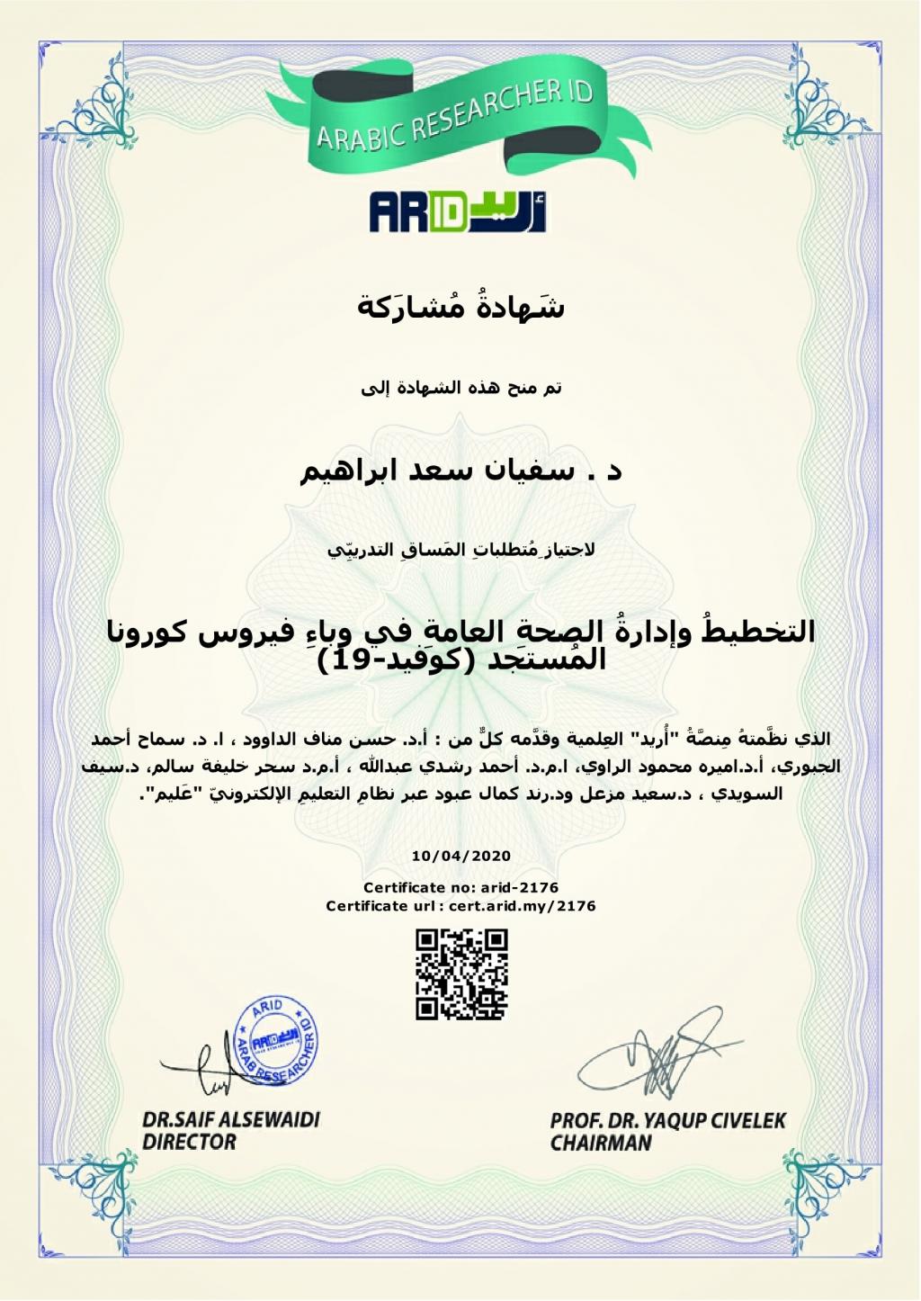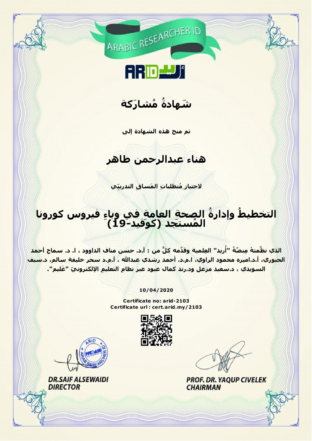دورات في إدارة الصحةشارك نخبة من أساتذة كلية العلوم الإسلامية في الدورة التدريبية التي أقامتها منصة أريد لاجتياز متطلبات المساق التدريبي (التخطيط وادارة الصحة العامة في وباء فيروس كورونا المستجد كوفيد-19) وتم إكمال هذه الدورة بنجاح وإعطاء شهادات مشاركة الكترونية لكل من:الدكتور سفيان سعد ابراهيمالمدرس المساعد هناء عبد الرحمنوتشكر عمادة الكلية كل الأساتذة الذين ساهموا في هذه الدورات وتدعو إلى المزيد من المشاركات الفعالة في خدمة المجتمع.