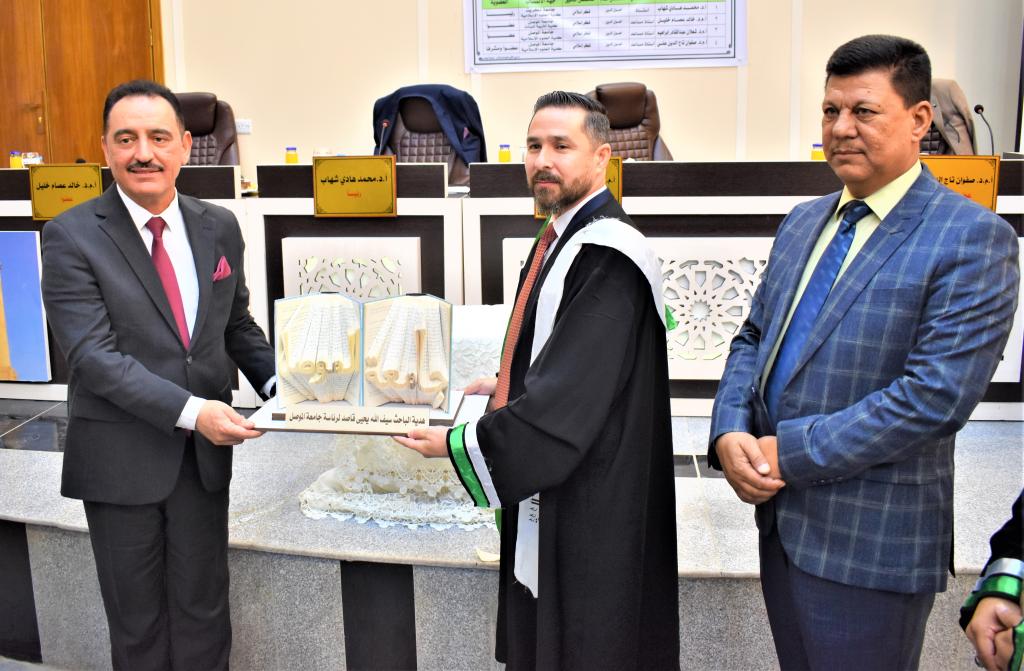 حضر السيد رئيس جامعة الموصل الأستاذ الدكتور قصي كمال الدين الاحمدي المحترم مناقشة رسالة الماجستير للطالب (سيف الله يحيى قاصد) في قسم العقيدة والفكر الإسلامي الموسومة (الفنون الإبداعية في المنظور الإسلامي دراسة فكرية معاصرة)، يوم الخميس الموافق 6/10/2022. وقد حضر الأستاذ الدكتور نشأت مبارك صليوا عميد كلية الفنون الجميلة وبحضور الأستاذ الدكتور رأفت لؤي حسين معاون العميد للشؤون العلمية والأستاذ المساعد الدكتور ثابت مهدي حمادي معاون العميد للشؤون الإدارية مع عدد من تدريسي الكلية. تناولت الرسالة لمحة عن تاريخ الفنون في عصر النبوة والخلفاء الراشدين والعصر الاموي والعباسي ومن ثم تصنيفات الفنون وطرح فكرة الفن الهادف وكيفية استخدام الفن كوسيلة للدفاع عن الإسلام وعرضت نماذج من الفنانين المسلمين بمختلف الفنون. كما تطرقت الدراسة الى طرح المفاهيم الدالة لحل الإشكالات التي تقع حول مفهوم الفنون ومعالجتها معالجة فكرية إسلامية فضلاً عن طرح وجهة نظر الفكر الإسلامي حول الفنون المختلفة من شعر او نحت او انشاد وامور أخرى. توصلت الدراسة الى ان الإسلام ليس خالياً من الفنون المتنوعة من انشاد وشعر ورسم وفنون اخرى هادفة كان لها وجود منذ عهد الرسول محمد صلى الله عليه وسلم.وقد أهدي الطالب سيف الله يحيى قاصد منحوتة الى رئاسة جامعة الموصل للنحاتة زهراء حيدر من مدينة السماوة تنحت الكتب بأشكال فنية دون الاضرار بالكتاب بحيث يبقى صالحاً للقراءة وتعد النحاتة الوحيدة التي تمارس هذا الفن في الشرق الاوسط ترأس لجنة المناقشة الأستاذ الدكتور محمد هادي شهاب وعضوية كل من الاستاذ المساعد الدكتور خالد عصام خليل والأستاذ المساعد الدكتور شعلان عبد القادر ابراهيم، وبإشراف وعضوية الأستاذ المساعد الدكتور صفوان تاج الدين علي. تبارك عمادة الكلية ورئاسة القسم للباحث ولمشرفه هذا الانجاز العلمي المتميز.