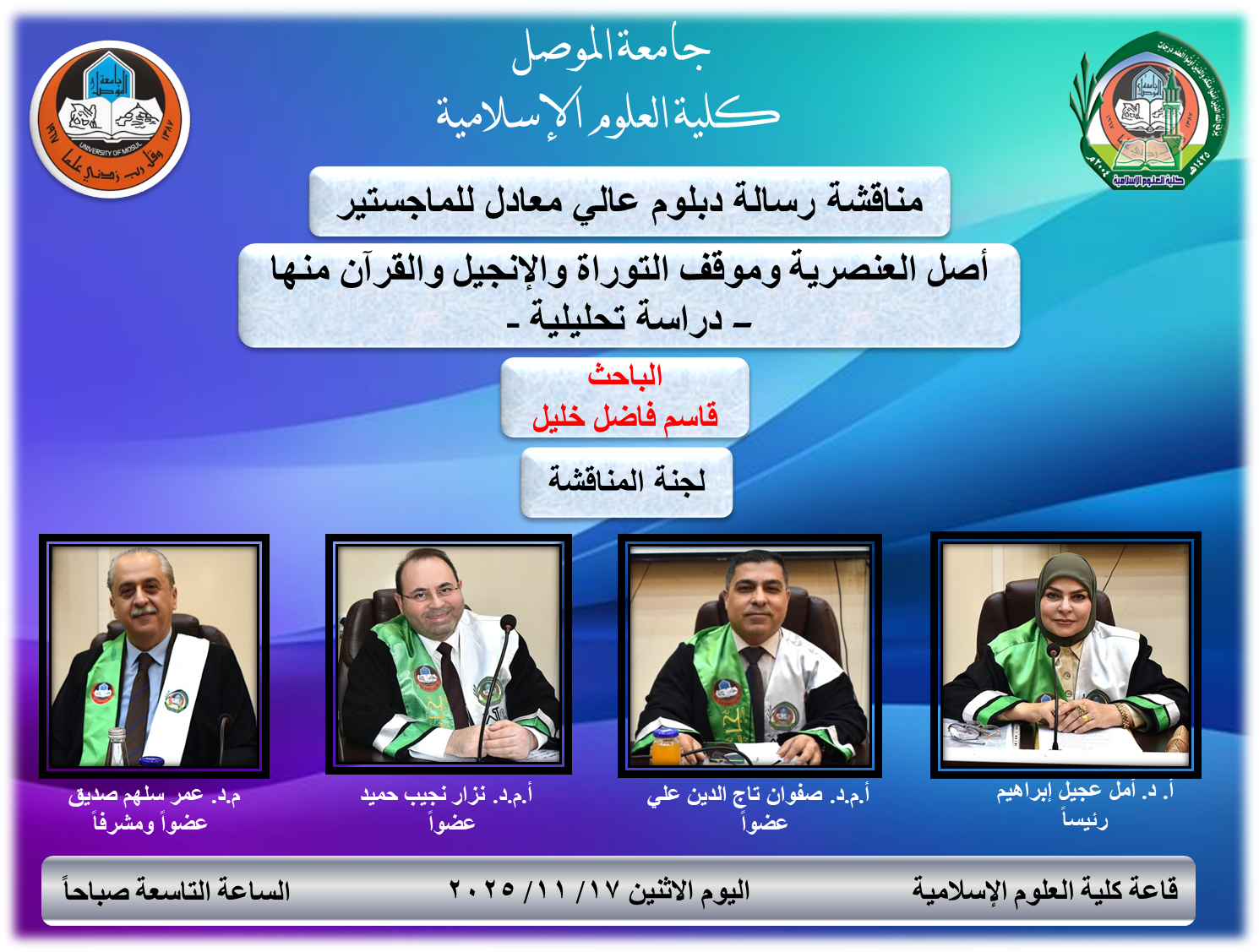 ausamaalghazal2025-11-17T12:28:28+03:00نوقشت في كلية العلوم الإسلامية- قسم العقيدة والفكر الإسلامي رسالة الدبلوم عالي المعادل للماجستير- الأمن الفكري . الموسومة بـ ( أصل العنصرية وموقف التوراة والإنجيل والقرآن منها - دراسة تحليلية - ). للطالب (قاسم فاضل خليل) وبإشراف الدكتور (عمر سلهم صديق آل صالح بك) . يوم الاثنين الموافق 17/11/2025. حضر جانباً منها السيد عميد كلية العلوم الإسلامية الأستاذ الدكتور طه حماد مخلف والأستاذ الدكتورة معالم سالم يونس معاون العميد للشؤون العلمية والدراسات العليا وعدد من تدريسيي الكلية . تناولت الرسالة موضوع العنصرية من حيث بيان أصلها وتتبع جذور الفكر العنصري وموقف الكتب السماوية الثلاثة منها من خلال التحليل الدقيق للنصوص والآيات [إقرأ المزيد]
