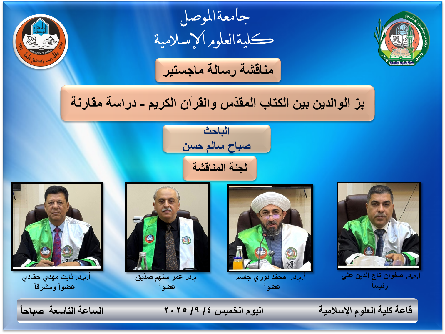ausamaalghazal2025-09-06T15:39:31+03:00نوقشت رسالة ماجستير في كلية العلوم الإسلامية - قسم العقيدة والفكر الإسلامي بعنوان ( برّ الوالدين بين الكتاب المقدّس والقرآن الكريم - دراسة مقارنة). للطالب ( صباح سالم حسن ) وبإشراف الأستاذ المساعد الدكتور ( ثابت مهدي حمّادي ). اليوم الخميس الموافق 4/ 9 /2025 . حضر جانباً منها الأستاذ الدكتور طه حماد مخلف وعدد من التدريسيين . تناولت موضوع برّ الوالدين بين الكتاب المقدّس والقرآن الكريم في دراسة مقارنة، مبرزًا مكانته في النصوص الدينية وأثره في بناء الفرد والمجتمع. وجاءت الدراسة استجابةً للتحديات المعاصرة التي تشهد تفشّي مظاهر العقوق وغياب القيم الأسرية، خاصة في ظل تأثير العولمة وضعف الوعي الاجتماعي [إقرأ المزيد]