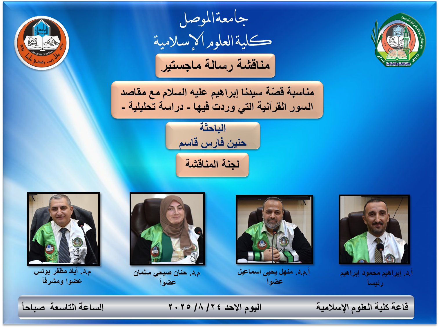 ausamaalghazal2025-08-24T11:47:21+03:00نوقشت هذا اليوم الأحد الموافق 24/ 8 /2025 في كلية العلوم الإسلامية بجامعة الموصل رسالة الماجستير الموسومة ( مناسبة قصّة سيدنا إبراهيم عليه السلام مع مقاصد السور القرآنية التي وردت فيها –دراسة تحليلية -) . حضر جانباً منها السيد عميد الكلية الأستاذ الدكتور طه حماد مخلف والسيدان المعاونان العلمي والإداري وعدد من تدريسيي الكلية . تناولت الرسالة التي تقدم بها الطالبة ( حنين فارس قاسم ) في قسم العقيدة والفكر الإسلامي . دراسة علمية لمواضع قصّة سيدنا إبراهيم الخليل عليه السلام في السور القرآنية، وبيان علاقتها بمقاصد تلك السور، وقد أفادت الدراسة في الكشف عن دقّة النظم القرآني، وثراء الاسلوب البلاغي [إقرأ المزيد]
