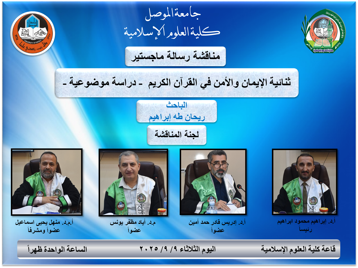 نوقشت في كلية العلوم الإسلامية  - قسم العقيدة والفكر الإسلامي  رسالة الماجستير الموسومة بـ ( ثنائية الإيمان والأمن في القرآن الكريم  - دراسة موضوعية -  ) . للطالب ( ريحان طه إبراهيم الراوي) . وبإشراف الأستاذ المساعد الدكتور (منهل يحيى اسماعيل) . اليوم الثلاثاء الموافق  9/  9 /2025 . حضر جانباً منها عميد الكلية  الأستاذ الدكتور طه حماد مخلف والدكتور محمد حازم شيت معاون العميد للشؤون الإدارية والمالية . تناولت الرسالة ثنائية الإيمان والأمن في القرآن الكريم, (دراسة موضوعية) ـ مُعرِّفةً بمفهوم الإيمان والأمن والعلاقة بين المفهومين, ومبينةً أهمية كل منهما مع بيان أقسام الإيمان والأمن وما يندرج تحت كل قسم [إقرأ المزيد]