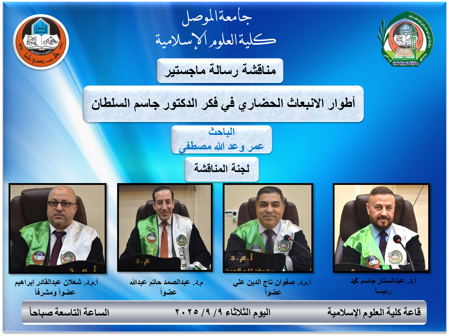 ausamaalghazal2025-09-09T11:10:15+03:00نوقشت في كـلية العلوم الإسـلامية - قـسم العـقيـدة والـفكر الإسـلامي. رسـالة الماجستير الموسومة بـ (أطوار الانبعاث الحضاري في فكر الدكتور جاسم السلطان) للطالب (عمر وعدالله مصطفى الحاصود) . وبإشراف الأستاذ المساعد الدكتور(شعلان عبدالقادر إبراهيم) اليوم الثلاثاء 9 /9 /2025. حضر جانباً منها عميد الكلية الأستاذ الدكتور طه حماد مخلف والدكتور محمد حازم شيت معاون العميد للشؤون الإدارية والمالية وعدد من التدريسيين وطلبة الدراسات العليا . تناولت الرسالة موضوع (أطوار الانبعاث الحضاري في فكر الدكتور جاسم السلطان) التي تتضمن المشروع الحضاري لدى الدكتور جاسم السلطان، الذي يهدف إلى تحقيق النهضة الحضارية، من خلال فهم أطوار الانبعاث الحضاري التي تمثّل خارطة الطريق التي [إقرأ المزيد]