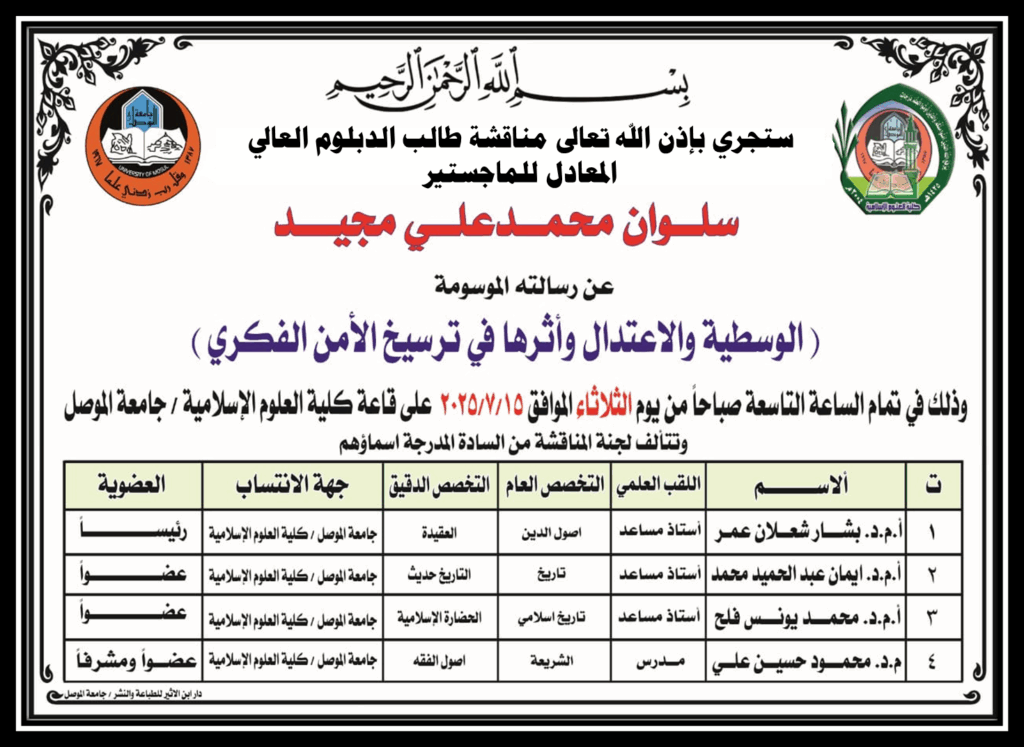 اعلان موعد مناقشة رسالة دبلوم عالي