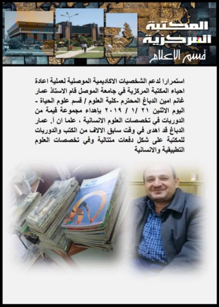استلمت المكتبة المركزية في جامعة الموصل يوم الاثنين الموافق 21/1/2019 وجبة جديدة من الاطاريح المهداة من كلية التربية للعلوم الانسانية وقد تم البدء على الفور بعملية فرزها وتنظيمها تمهيدا لفهرستها لتكون جاهزة لاعارتها للطلبة والباحثين خدمة للجهد العلمي والبحثي في جامعتنا العزيزة