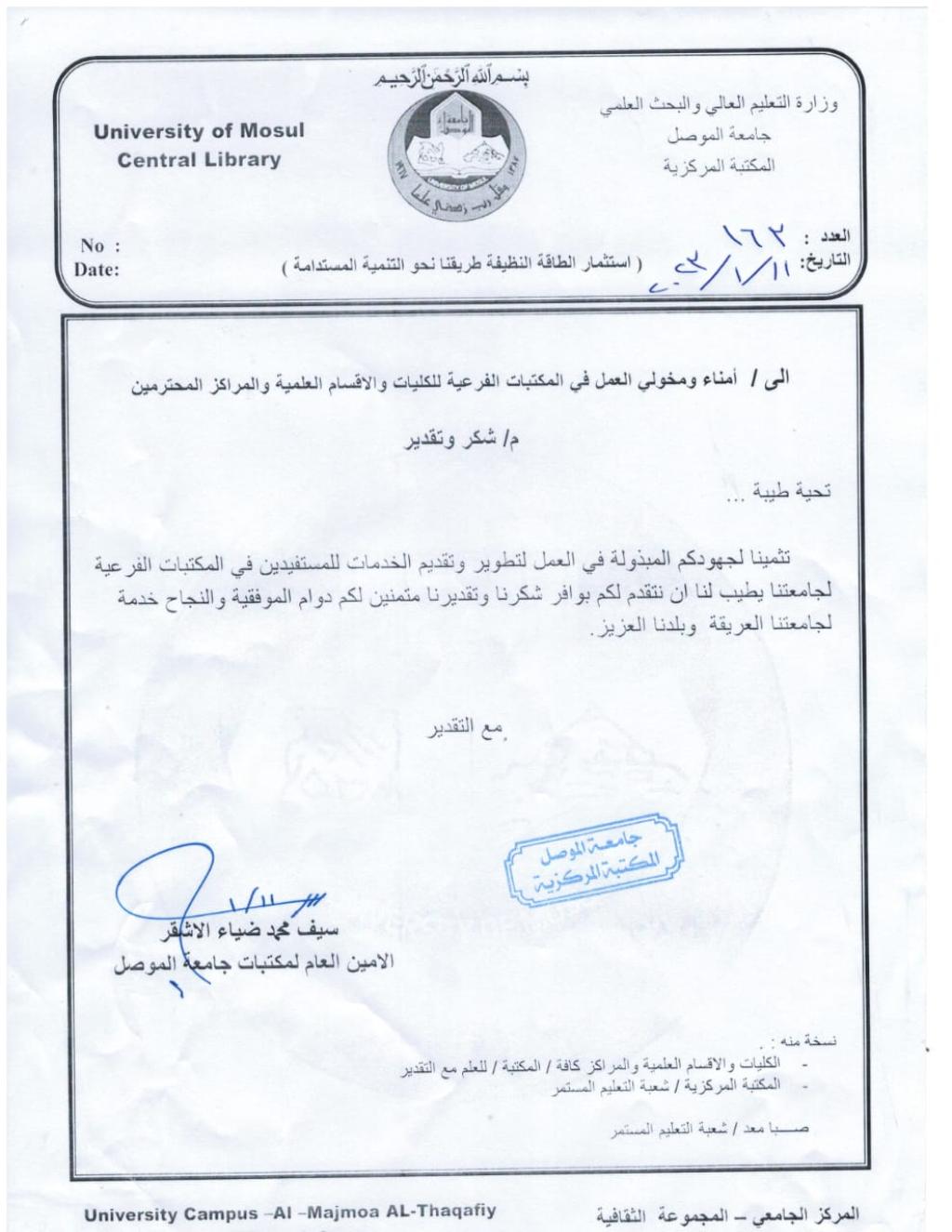 تفعيلاً لسياسة التطوير المستمر للكوادر الفنية والتقنية للجامعة واعتماد مبدأ العمل المشترك بموجب توجيهات الاستاذ الدكتور قصي الاحمدي رئيس جامعة الموصل، ترأس الاستاذ سيف الاشقر الامين العام لمكتبات جامعة الموصل اليوم الاربعاء الموافق 11/1/2023 في المكتبة المركزية اجتماعاً موسعاً حضره امناء المكتبات الفرعية للجامعة لمناقشة ” خطة سير العمل الفني في المكتبات ” وذلك لتوحيد صيغ عمل الاجراءات الفنية وخدمات المستفيدين والنظم المحوسبة في كافة مكتبات الجامعة هذا وقد حضر الاجتماع مسؤولي الشعب في المكتبة وتضمن شرحاً لاهم الاجراءات الفنية واجراءات خدمات المستفيدين والنظم المحوسبة الواجب السير وفقها من قبل مكتبات الجامعة كافة، كما تضمن الاجتماع مناقشة ما تم من الاعمال خلال السنة الماضية وخطط عمل عام 2023 واعتماد الادخال الالكتروني الموحد، تلا ذلك طرح الموضوعات ذات العلاقة من خلال المداولات والاجابة على كافة الاستفسارات التي طرحها الذوات الحضور من قبل السيد الامين العام والذي ختم الاجتماع بدعوته لضرورة تواصل التعاون والتنسيق المشتركين مابين كل من الامانة العامة لمكتبات الجامعة وامناء المكتبات الفرعية بما يضمن النهوض بواقع مكتبات الجامعة وتقديمها لافضل الخدمات للمستفيدين من طلبة وباحثين في الجامعة، وبعد الانتهاء من الاجتماع قام السيد الامين العام لمكتبات جامعة الموصل مع مسؤولي الشعب وامناء المكتبات الفرعية باجراء جولة تفقدية للمكتبات الفرعية في الكليات للاطلاع على سير العمل فيها وقدم الامين العام كتاب شكر وتقدير لامناء ومخولي العمل في المكتبات الفرعية للكليات والاقسام العلمية والمراكز متمنياً لهم دوام الموفقية