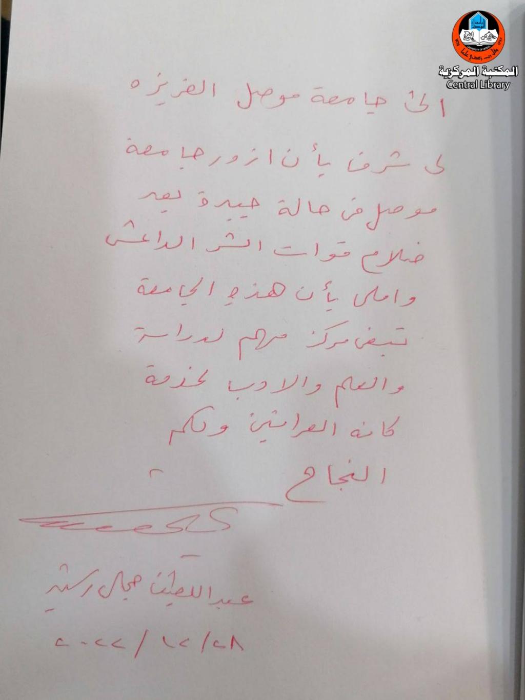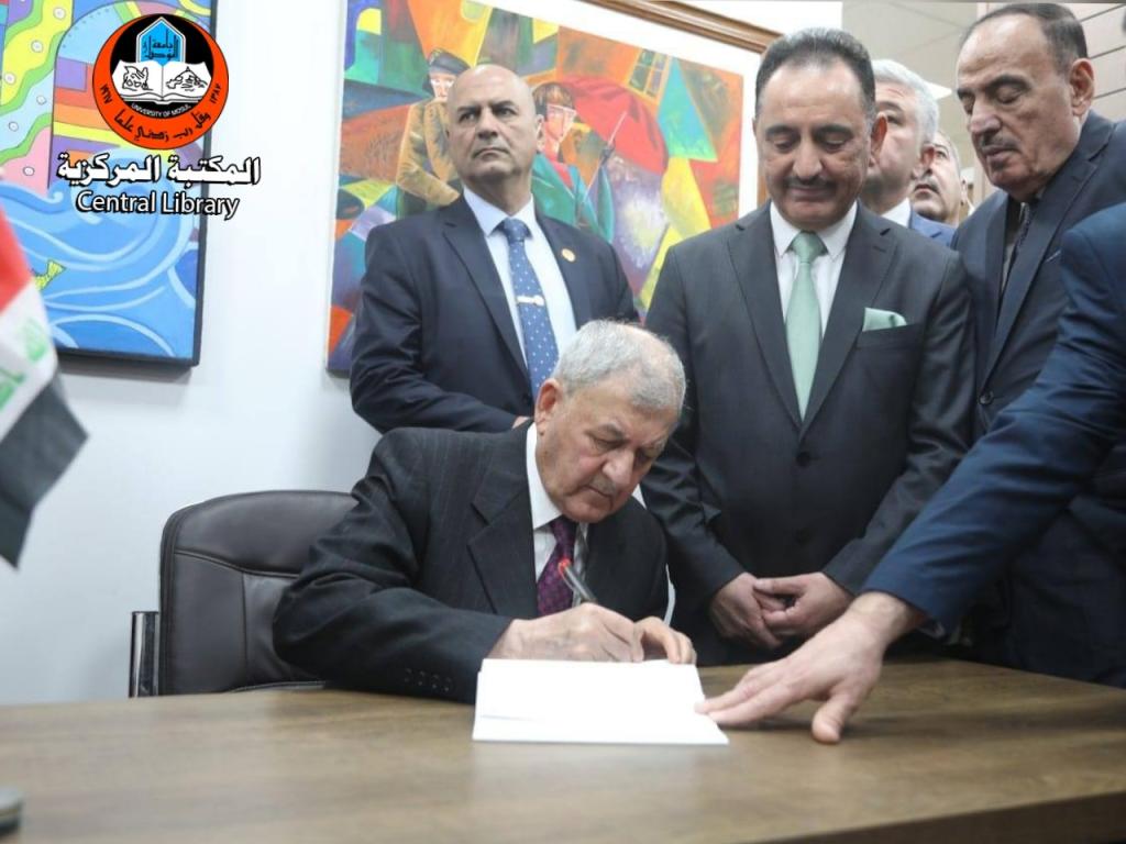 تجسيداً لدور جامعة الموصل في خدمة المجتمع بدعم من مؤسسات الدولة العراقية ، استقبل الاستاذ الدكتور قصي الاحمدي رئيس جامعة الموصل فخامة رئيس جمهورية العراق الدكتور عبداللطيف جمال رشيد والوفد المرافق ومعالي السادة الوزراء بحضور السيد محافظ نينوى وعدد من مسؤولي مؤسسات الدولة والجامعة ، وتحدث السيد رئيس جامعة الموصل والاستاذ سيف الاشقر الامين العام لمكتبات جامعة الموصل خلال الزيارة عن الخدمات التي تقدمها المكتبة بجهود منتسبيها وافراد المجتمع والجهات الداعمة، وقد ابدى فخامة رئيس الجمهورية اعجابه بما تم انجازه مؤكداً على دعمه المستمر لجامعة الموصل ومكتبتها المركزية وكافة المؤسسات العراقية لضمان تقديم افضل الخدمات في بلدنا العزيز